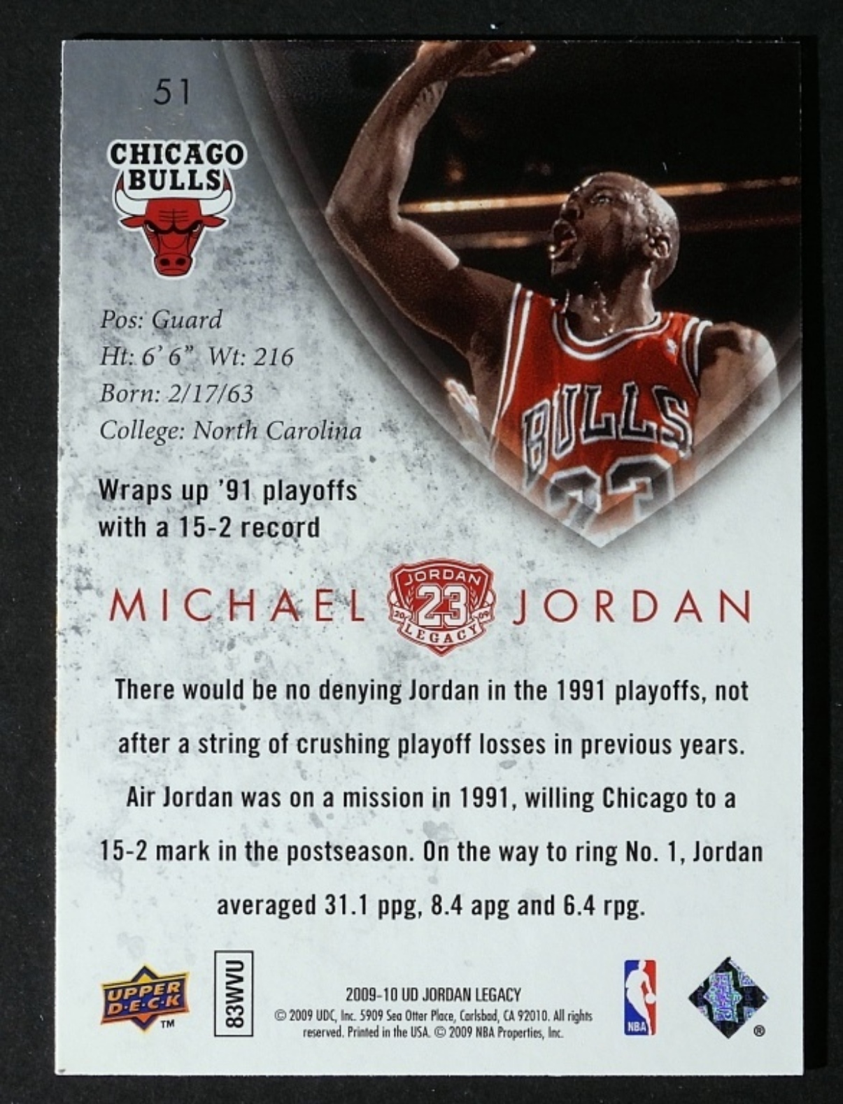 2009 MICHAEL JORDAN UPPER DECK ’91 PLAYOFFS CARD #51- (EXMT)