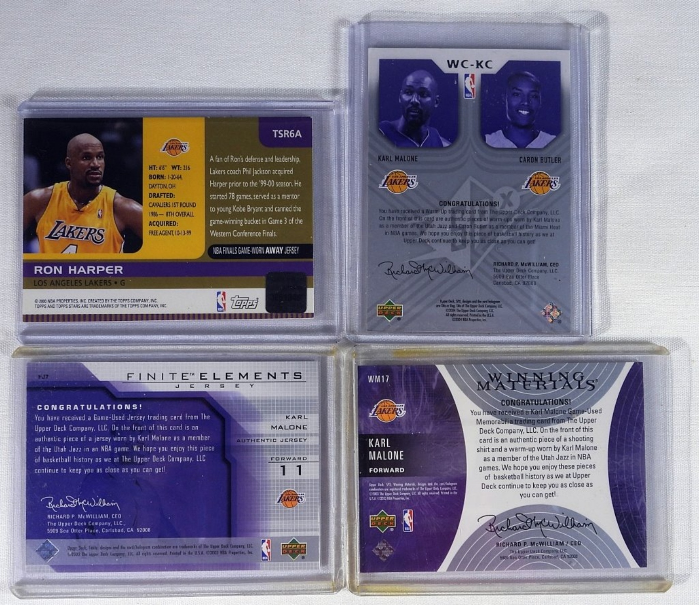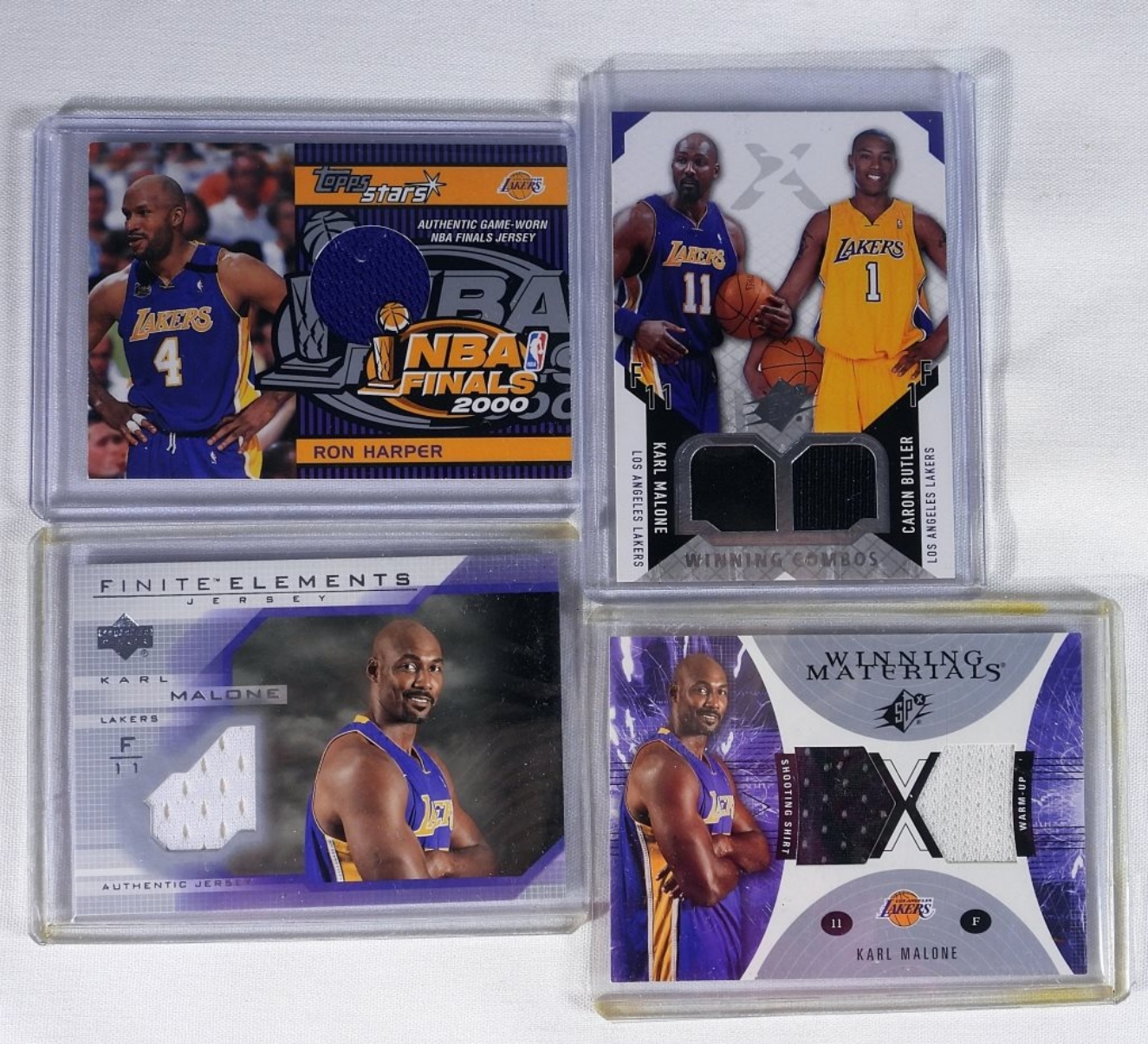 (4) VARIETY LAKERS AUTO JERSEY CARDS- 2004 KARL MALONE/CARSON BUTLER, 2000 RON HARPER, 2003 KARL MALONE- (EX) UNVERIFIED