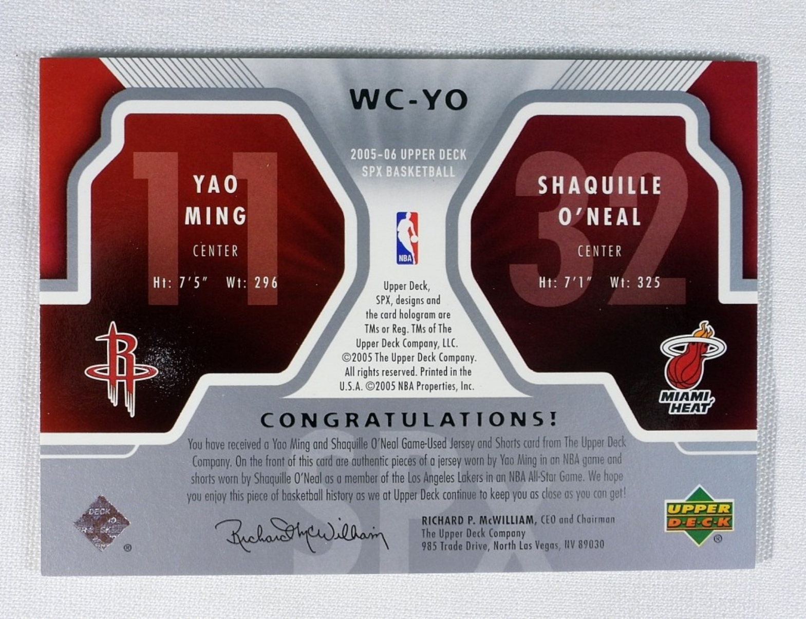 YAO MING/SHAQUILLE O’NEAL 2005 UD JERSEY CARD- (EXMNT)