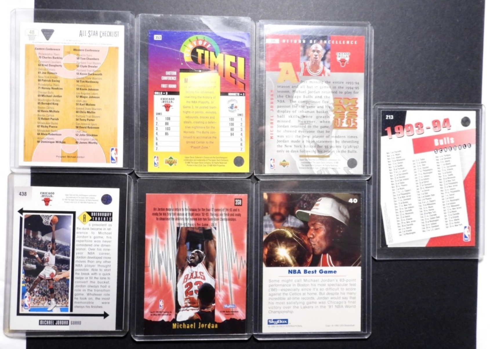 (7) VARIETY MICHAEL JORDAN SPORTS CARD, BRANDS/NUMBERS (SKYBOX1992 40, 1996 358, UPPER DECK 1995 335, 1995 353, 1991 48, 1993 438, 1993-94 213), (EX)