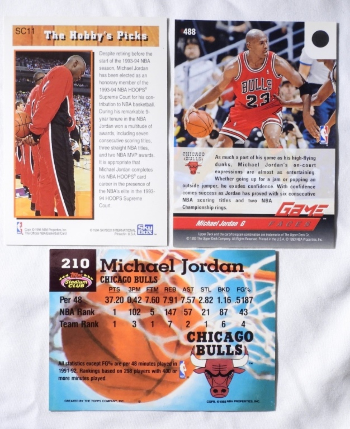 (3) MICHEAL JORDAN SPORTS CARDS 1994 SKYBOX SC11, 1993 TOPPS 210, 1993 UD 488 (VGEX)