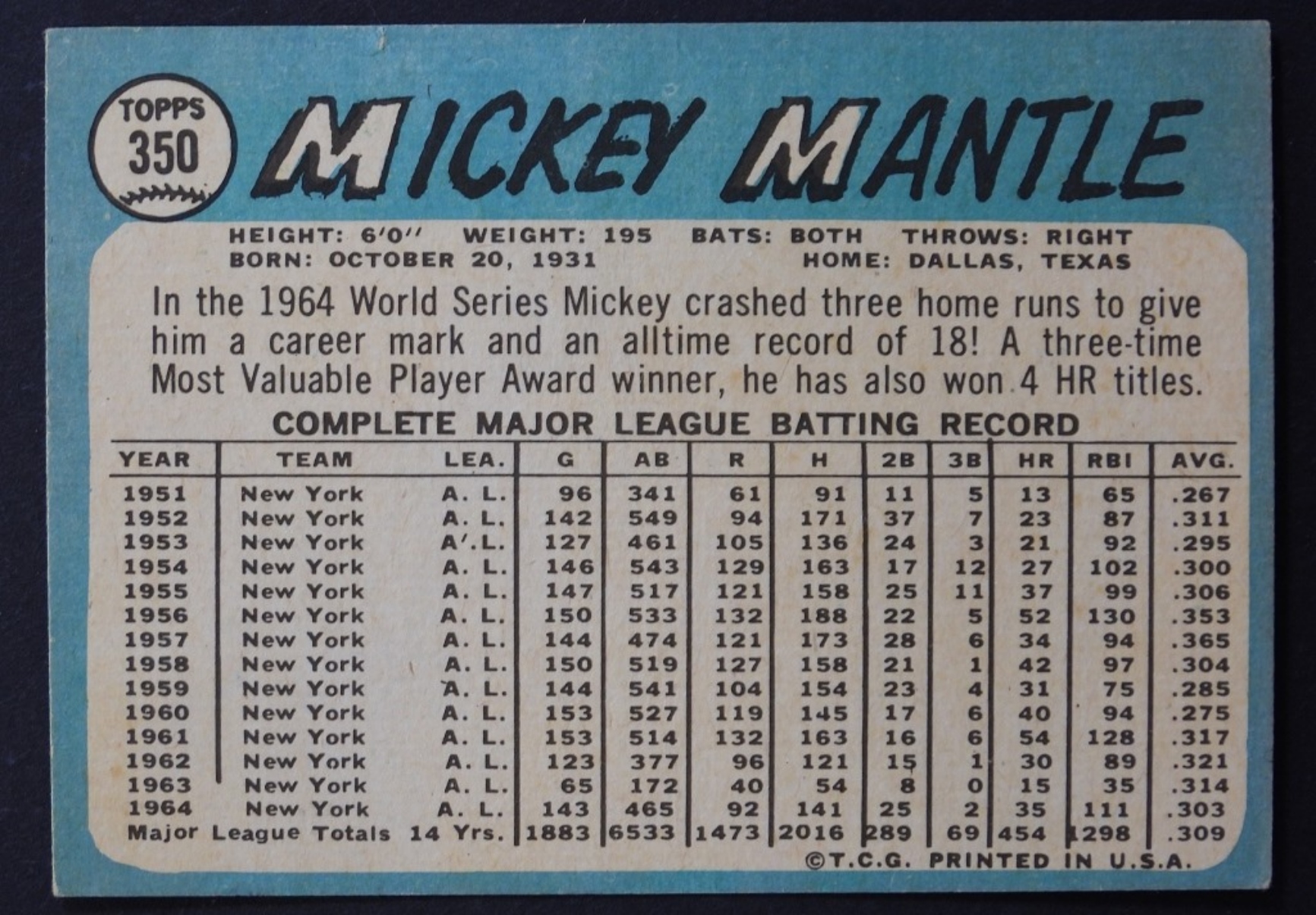 1965 TOPPS MICKEY MANTLE #350 EX+