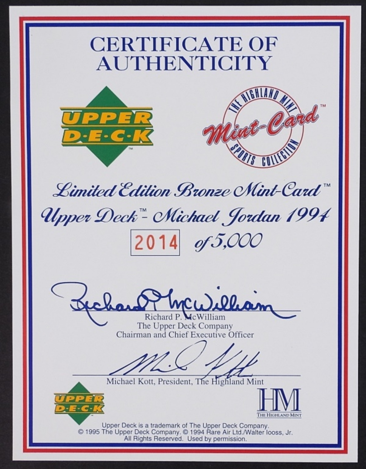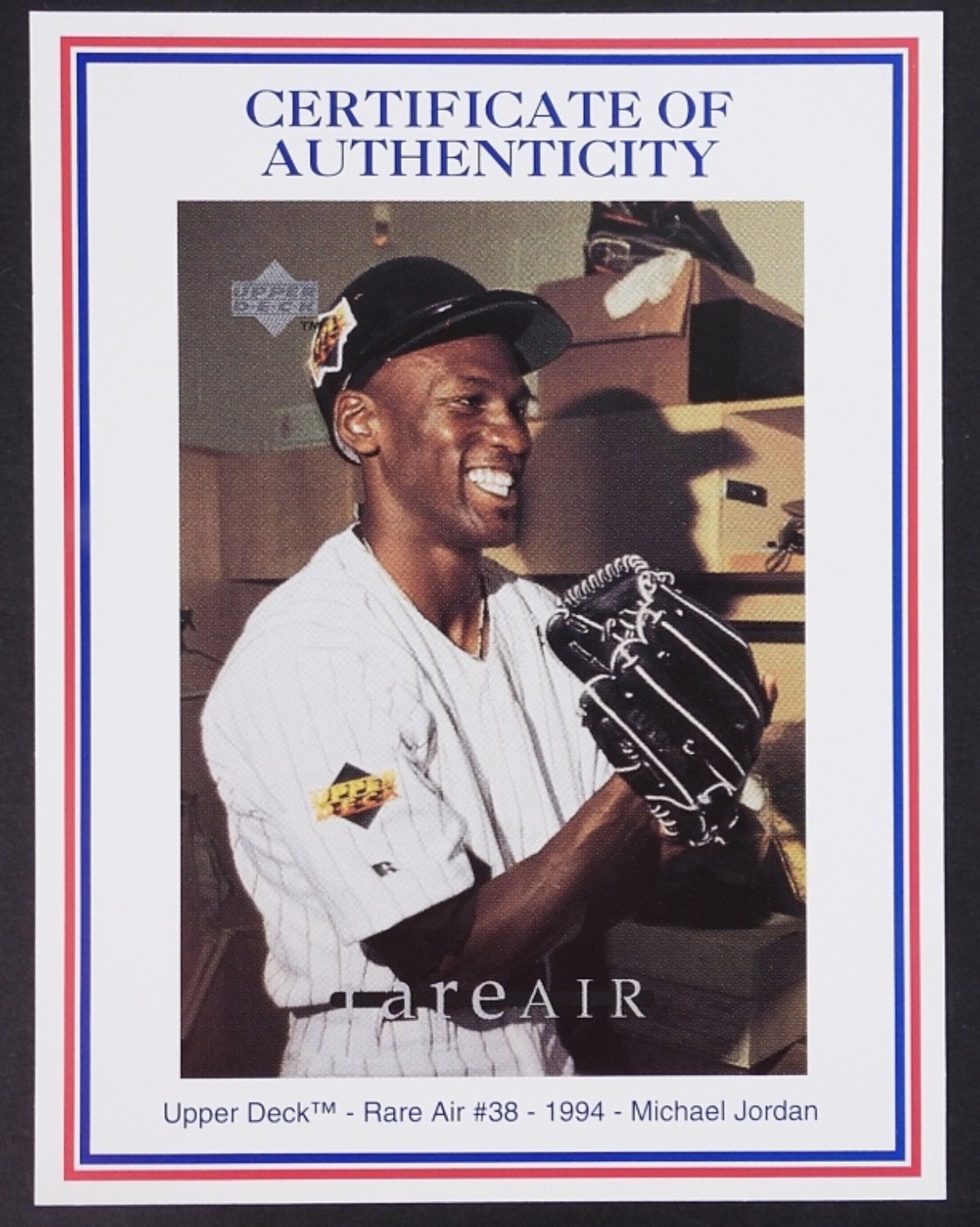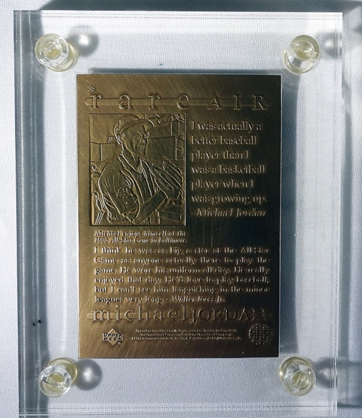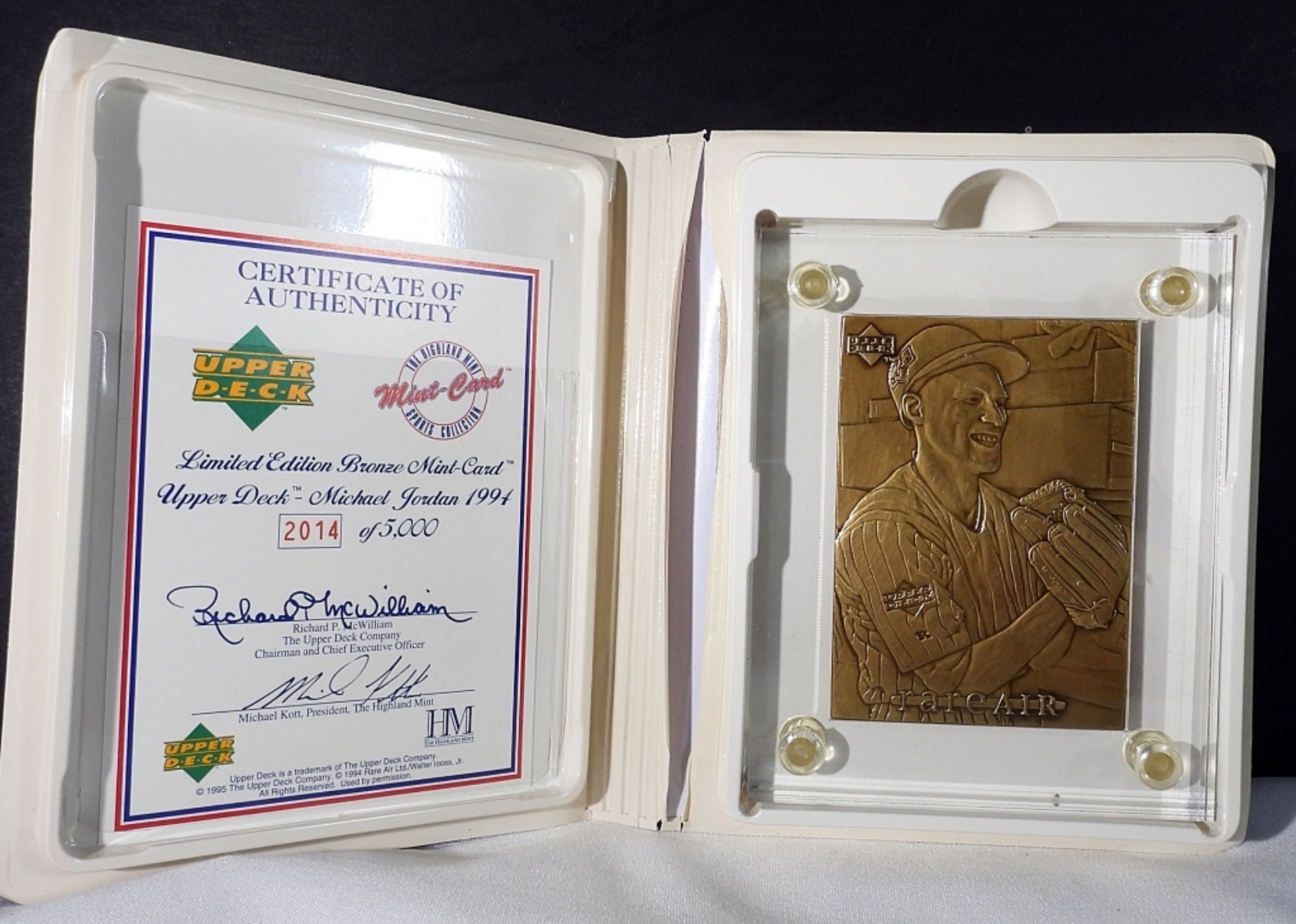 RARE AIR #38-1994 MICHAEL JORDAN, IN THE HIGHLAND MINT SPORTS COLLECTION CASE, CASE INSIDE IS RIPPED, COA FROM UPPER DECK AND THE HIGHLAND MINT SPORTS COLLECTION MINT LIMITED EDITION BRONZE 2014 OF 5000