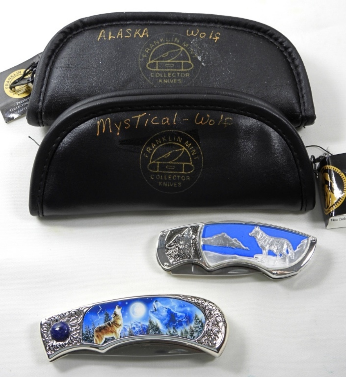 2 VINTAGE PAINTED ENGRAVED GIFT KNIVES WOLF STYLE