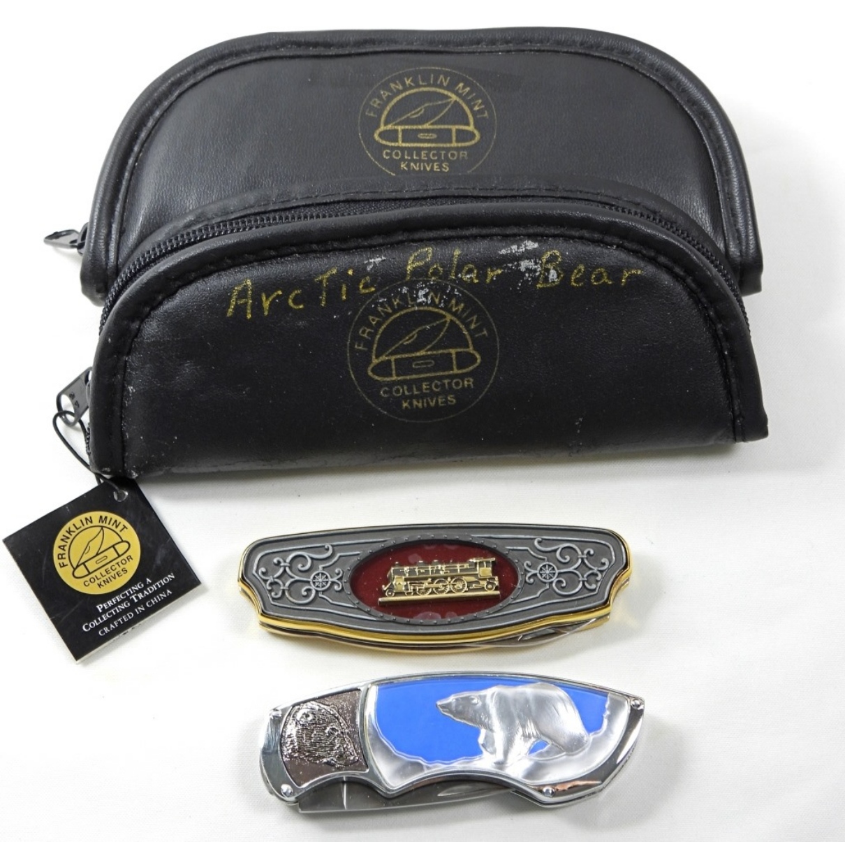 2 VINTAGE PAINTED ENGRAVED GIFT KNIVES POLAR BEAR/TRAIN STYLE