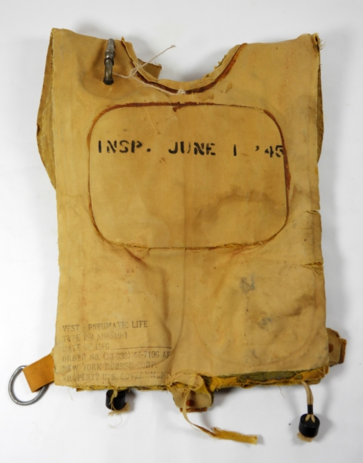VEST-PNEUMATIC LIFE TYPE B-4 AN6519-1 ORDER NO. (33-038) 44-7196 AF NEW YORK RUBBER CORP, PROPERTY U.S. GOVERNMENT. WAS INSPECTED ON JUNE 1 1945