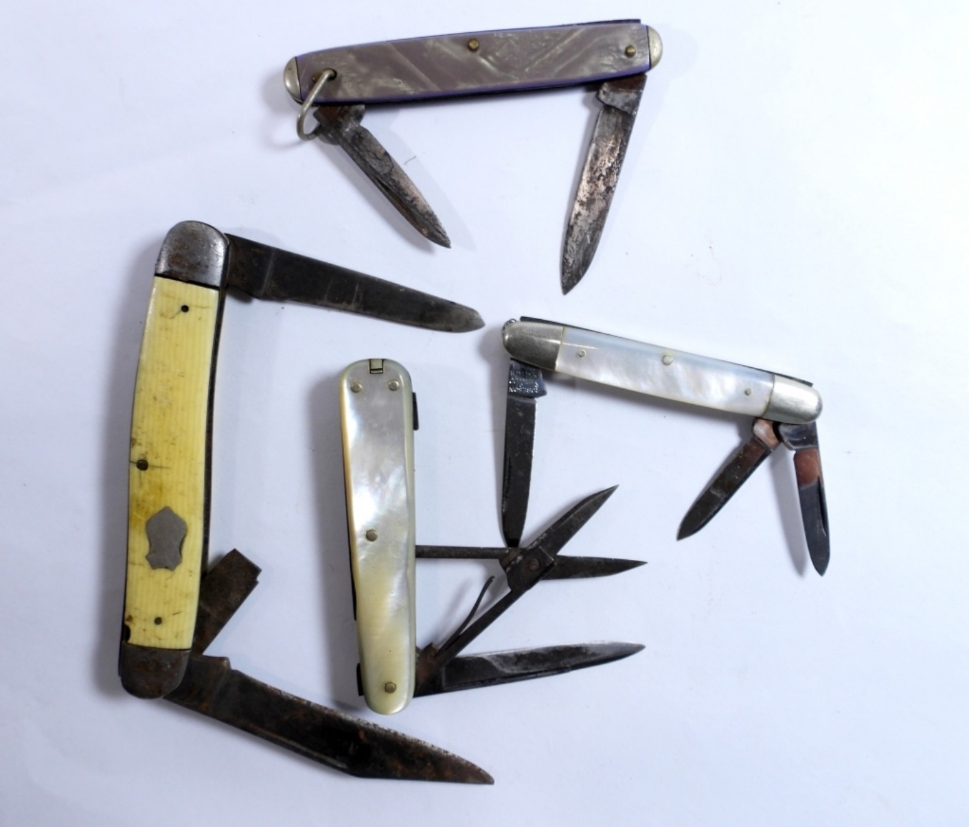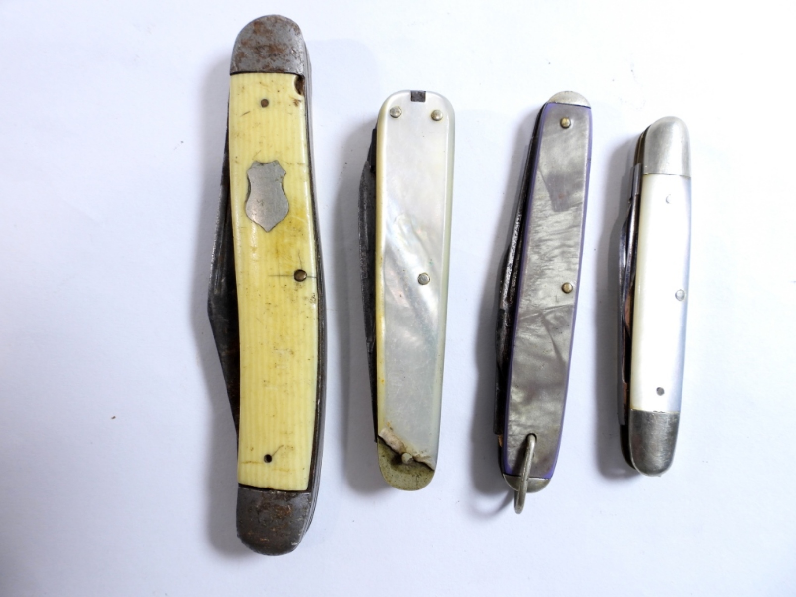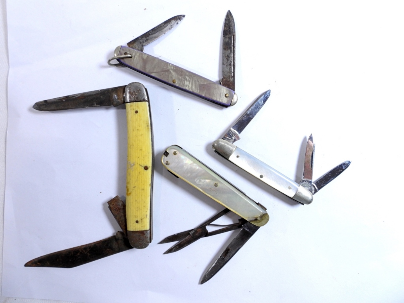4 yellow and pearl pocket knives by various brands, assorted sizes