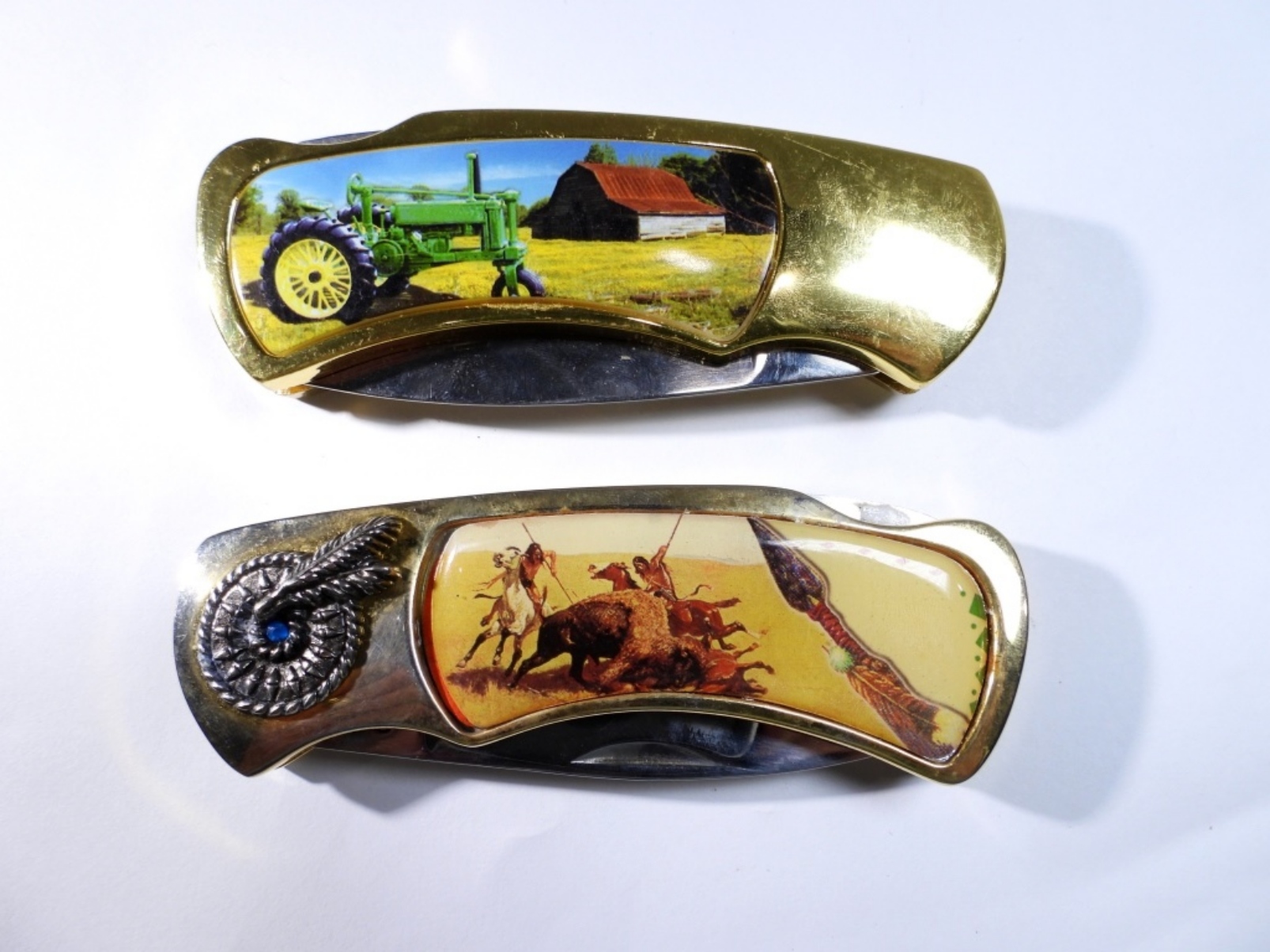 (2) TRACTOR/INDIAN STYLE POCKET KNIVES, BLADE 3”, KNIFE 7” ALL TOGETHER, KNIVES DO NOT COME IN ORIGINAL BOXES