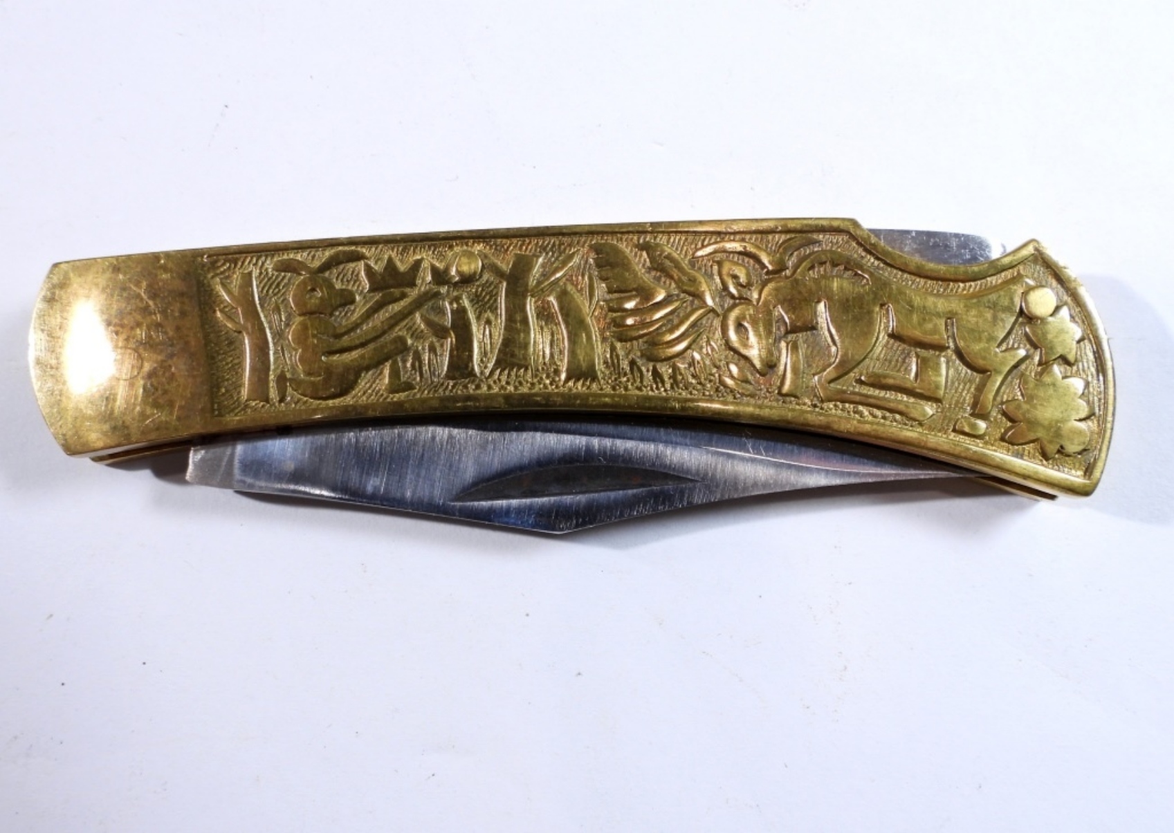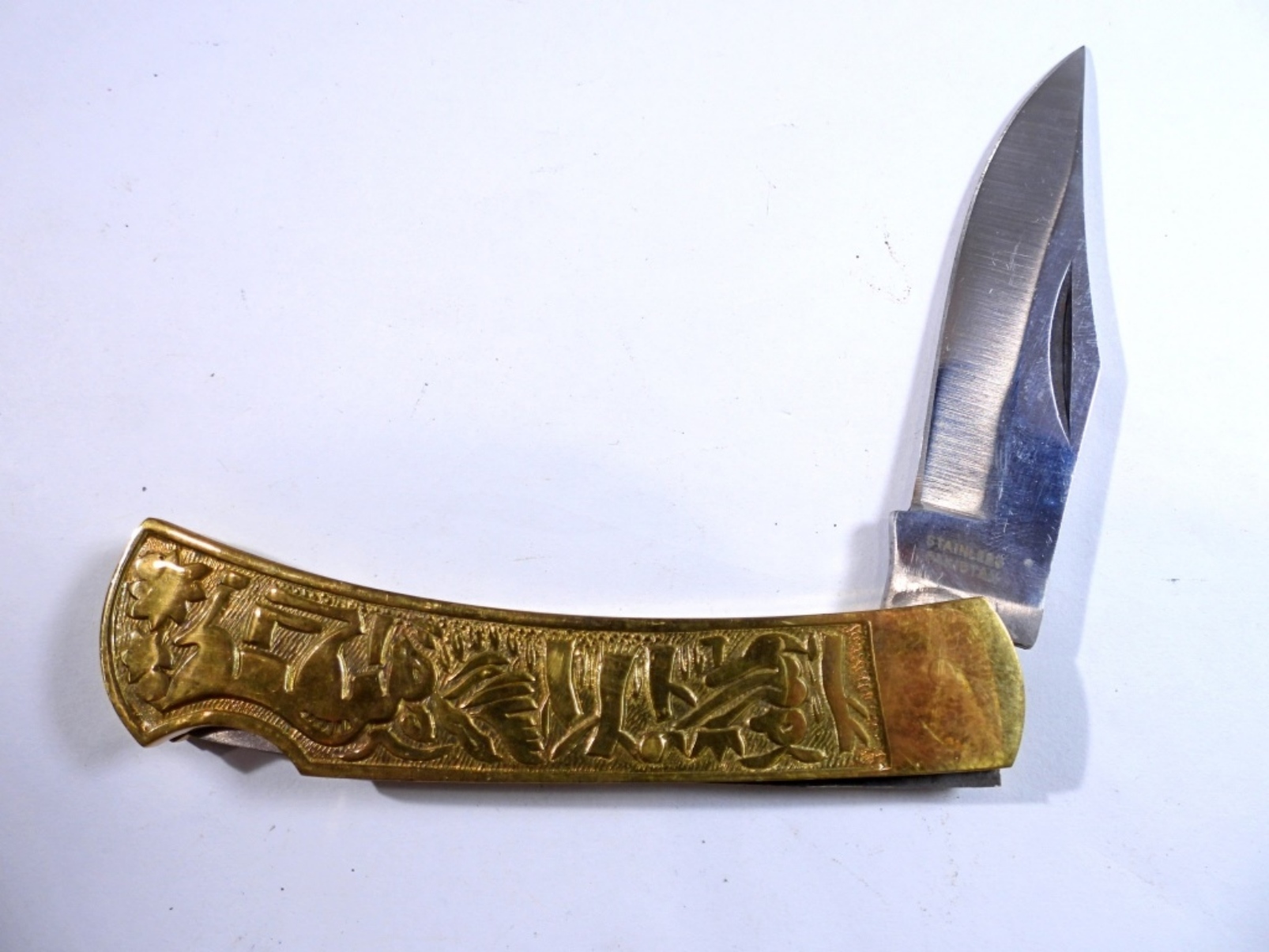 Pakistan engraved lockback knife, gold handle
