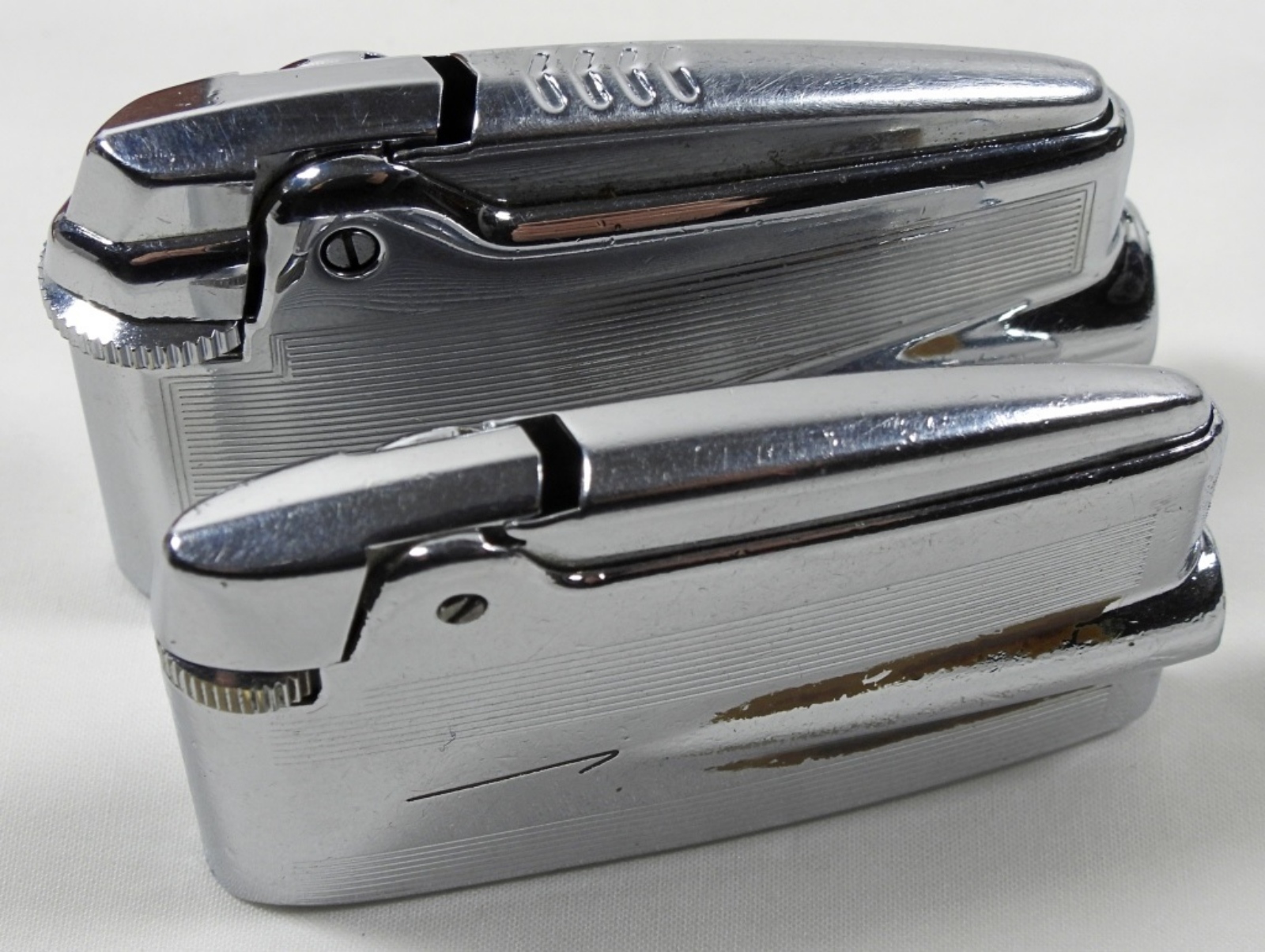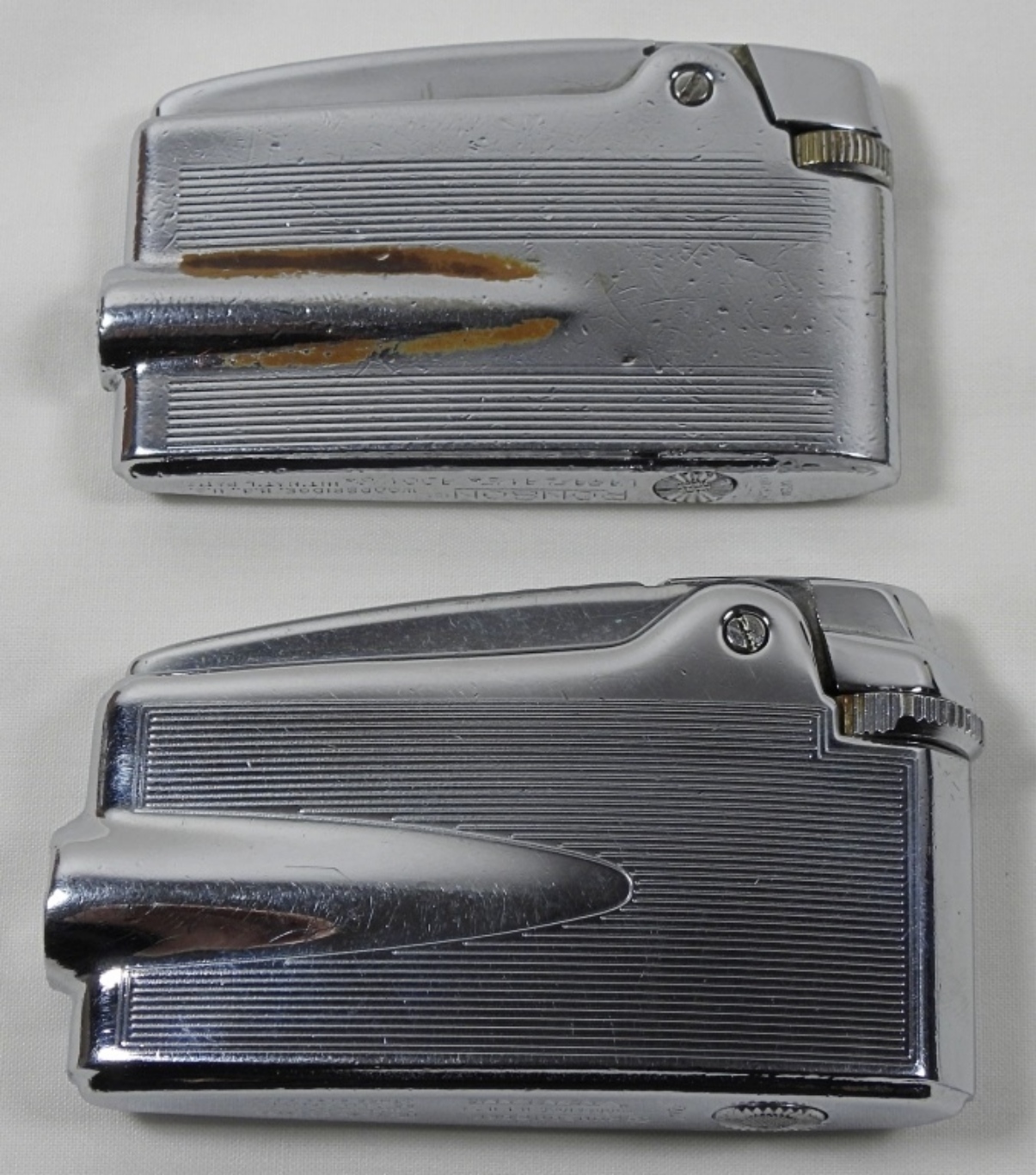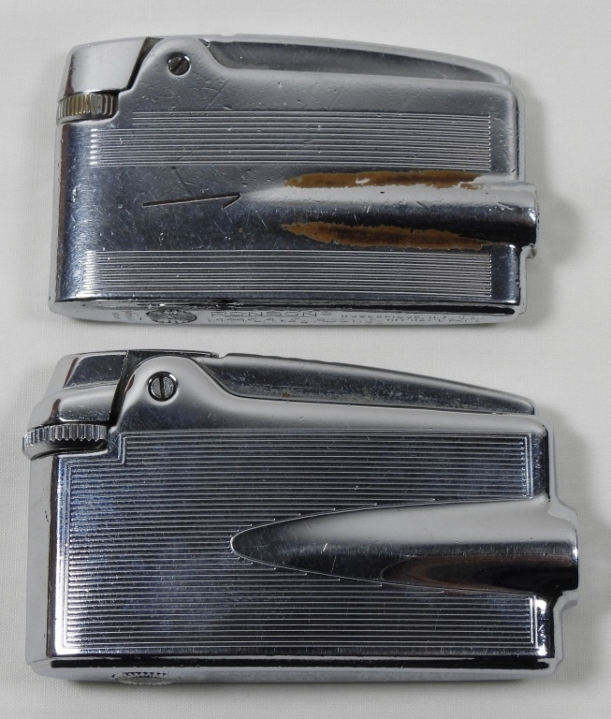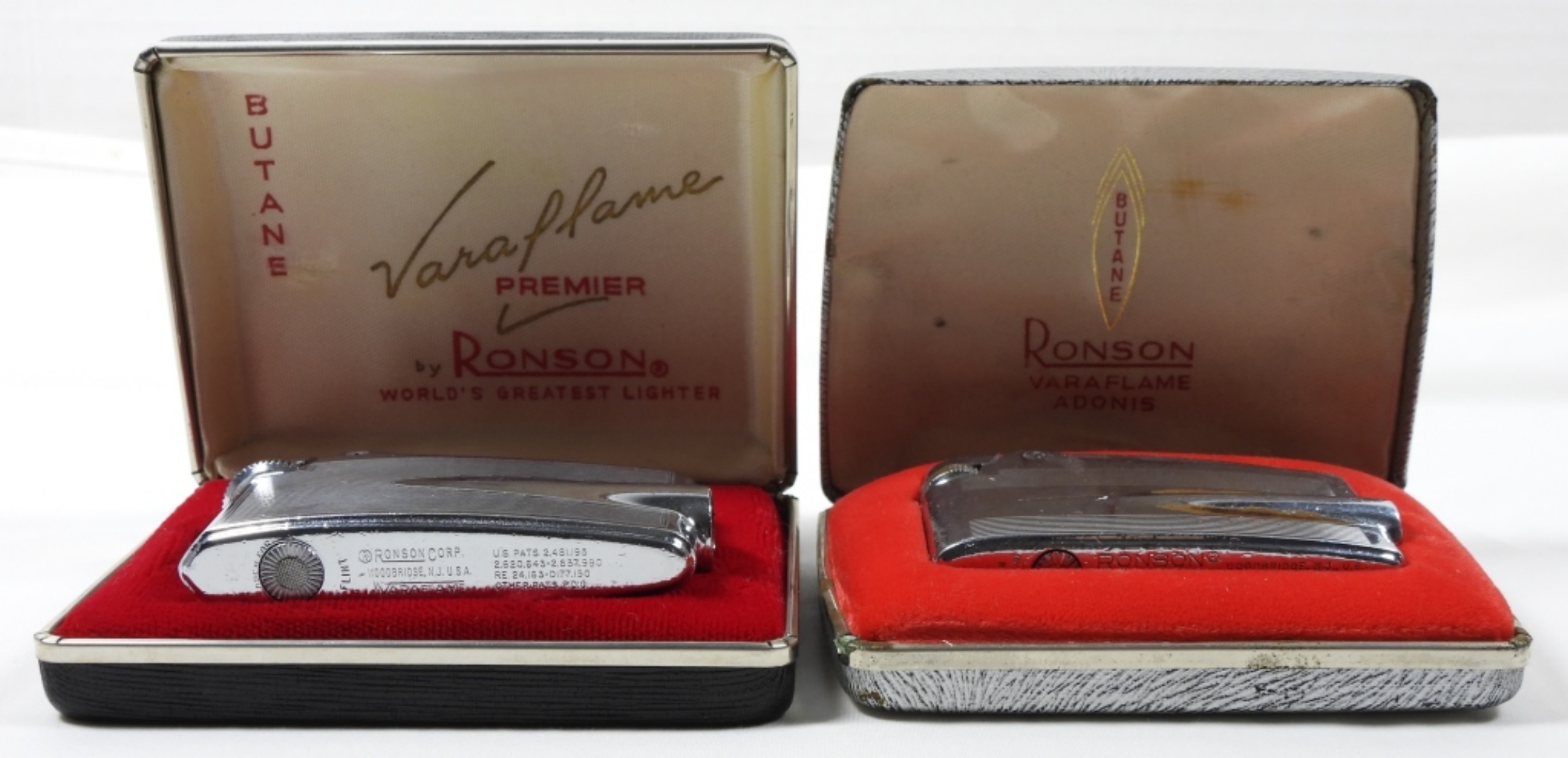 2 VINTAGE RONSON VARAFLAME BUTANE LIGHTERS IN SILVER FINISHES.