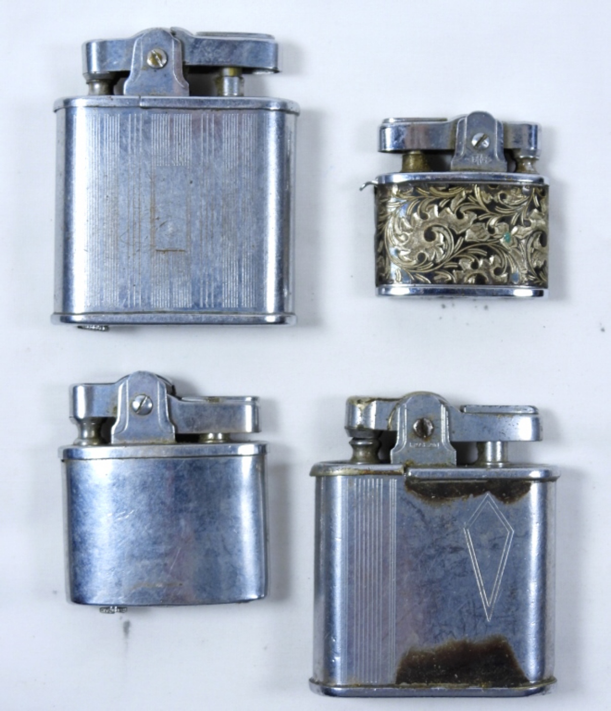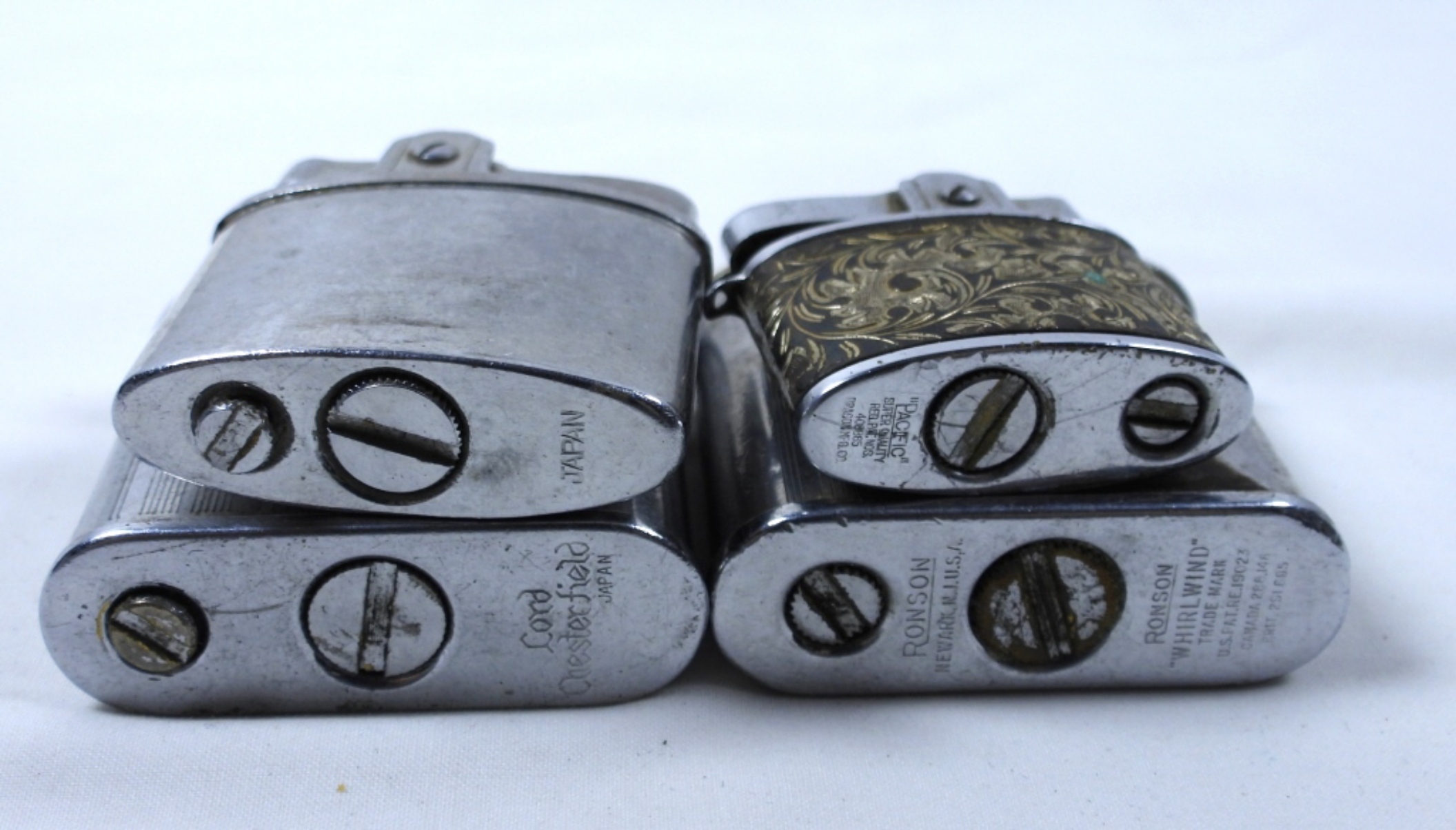 4 HAND HELD LIGHTERS LOT- LORD CHESTERFIELD- FIRED. RONSON-FIRED. PACIFIC- FIRED. THE LAST HAND HELD LIGHTER DOES NOT HAVE A BRAND MARK ON IT. ALL OF THESE LIGHTERS SHOW SOME WEAR PREOWNED. ALL OF THESE LIGHTERS ARE IN