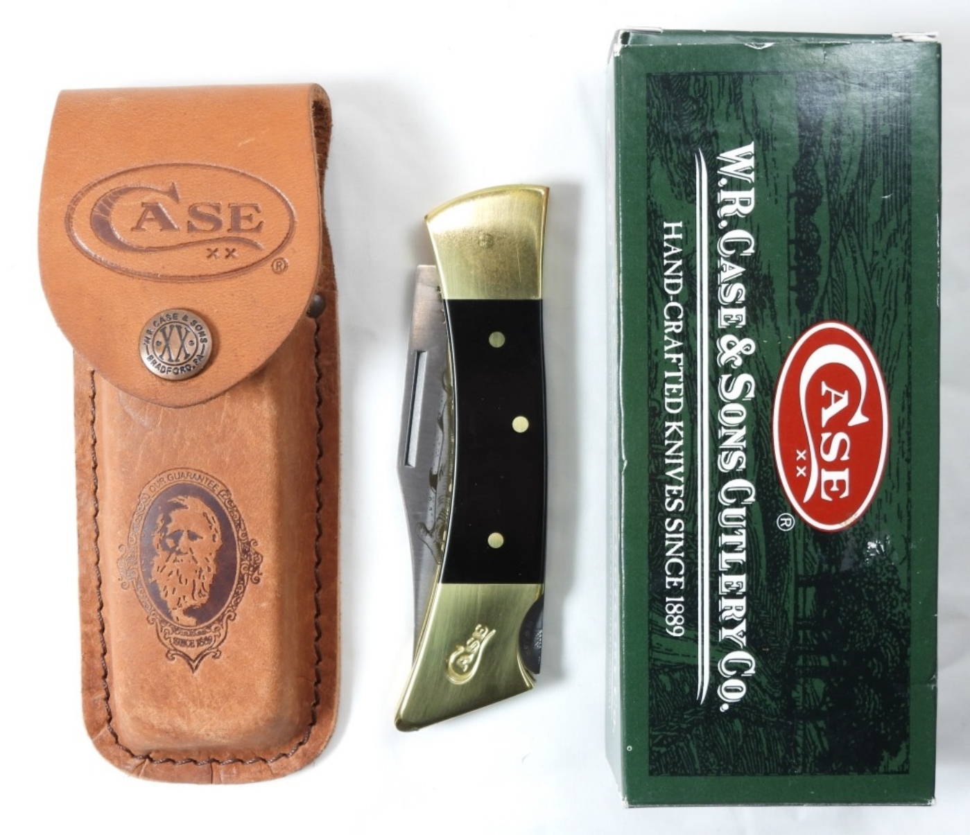 3 inch blade Case XX lockback knife, black and gold with a hammerhead shark on blade, with sheath, in original box