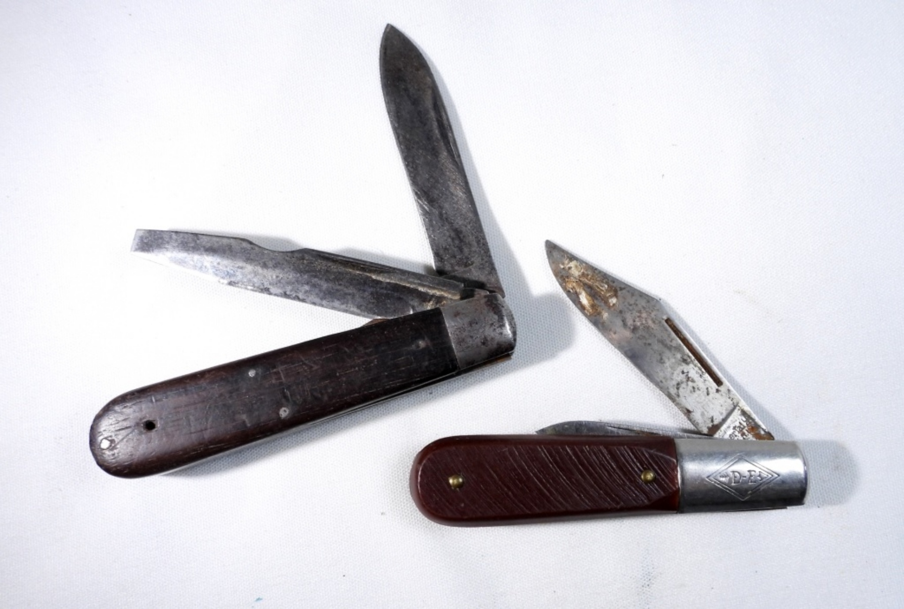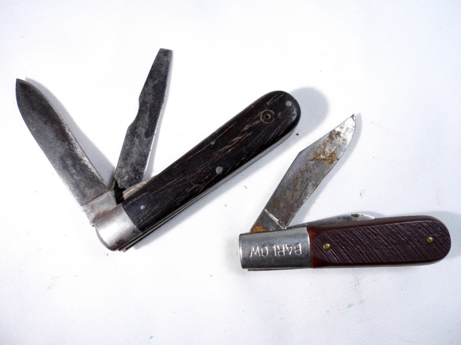 2 electrician pocket knives, one by Barlow, dark wooden handles, assorted sizes
