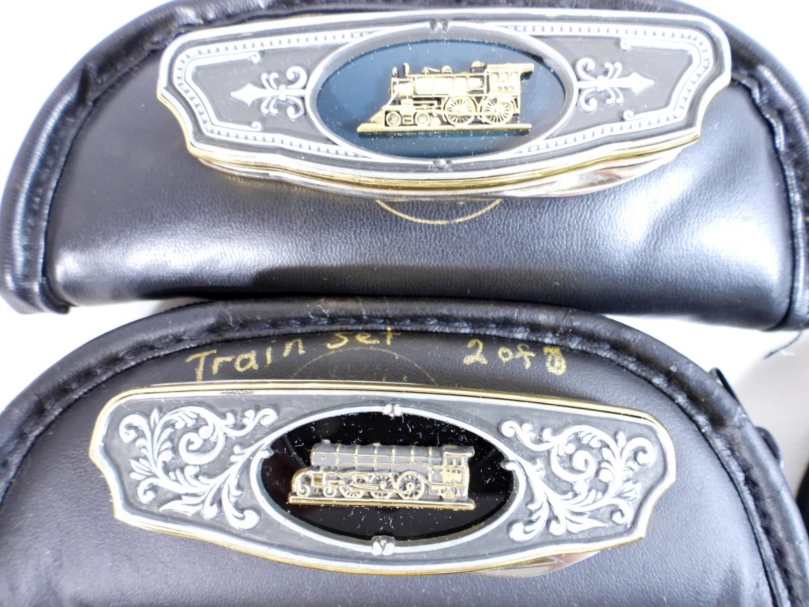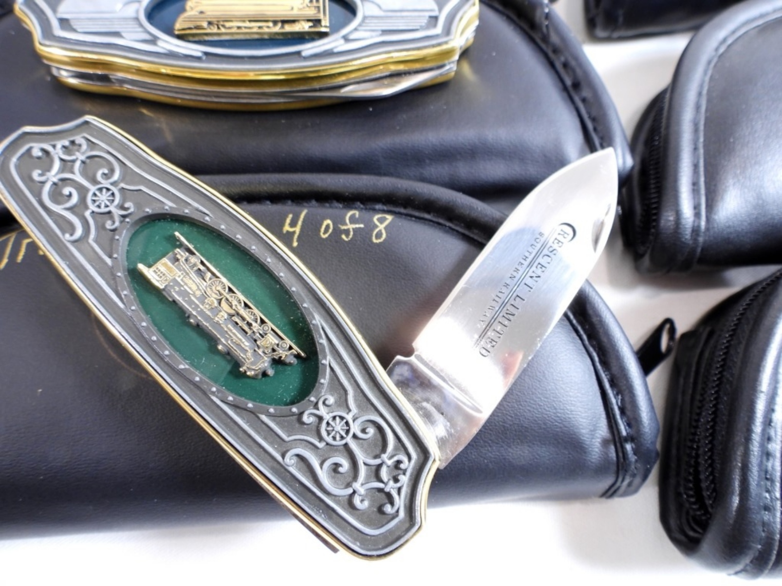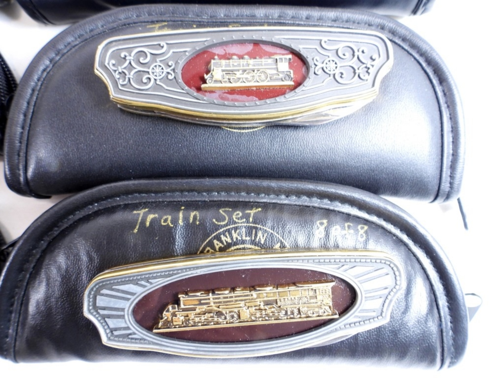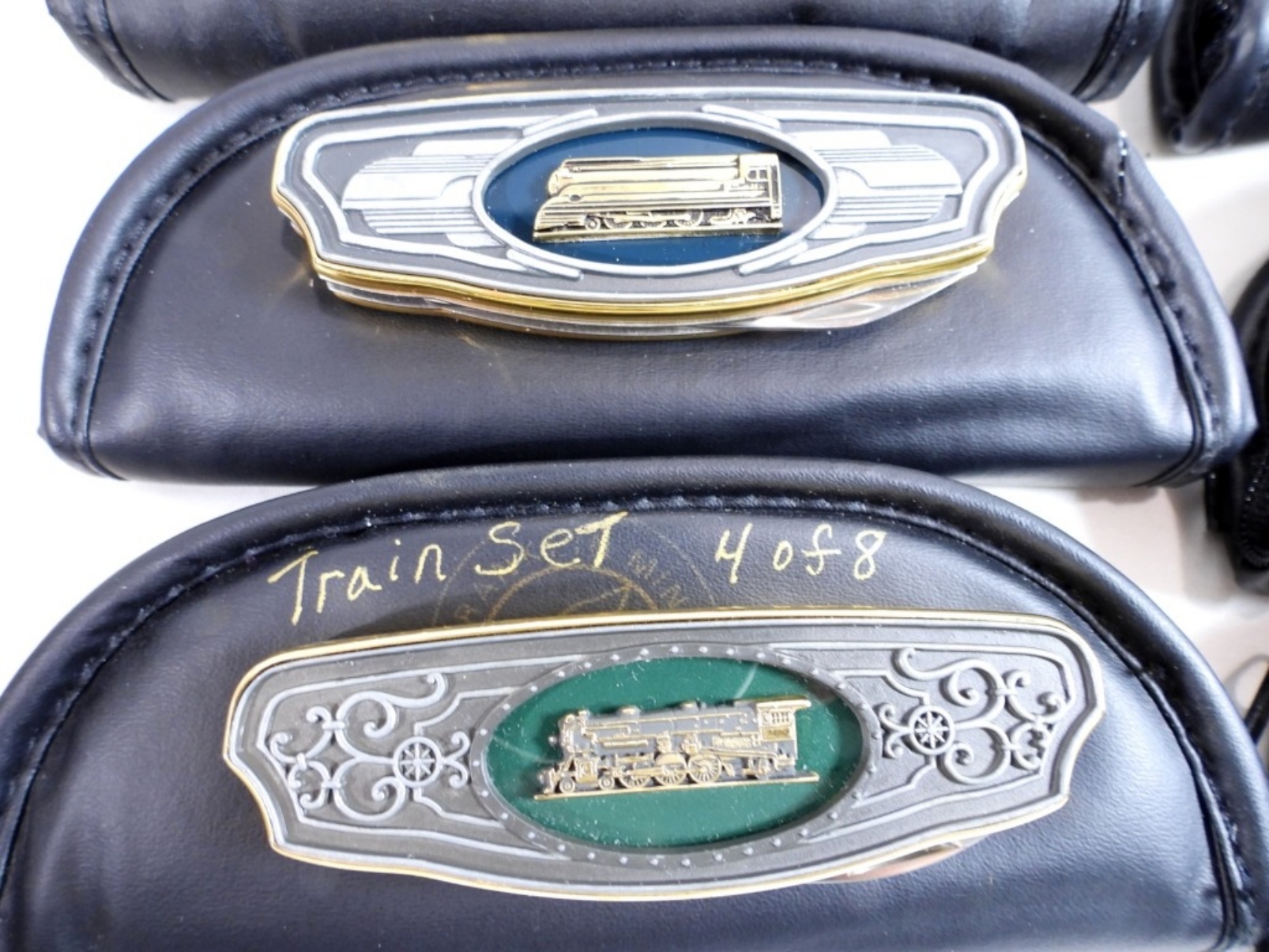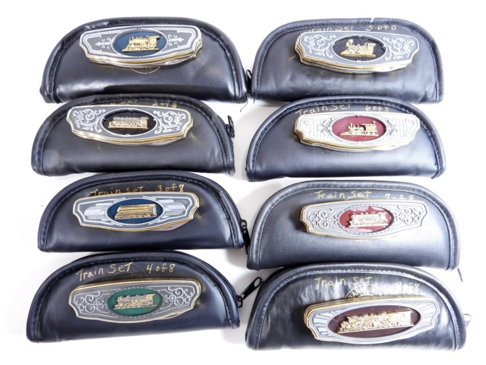 Set of 8 Franklin Mint Train Knives with pouches for each