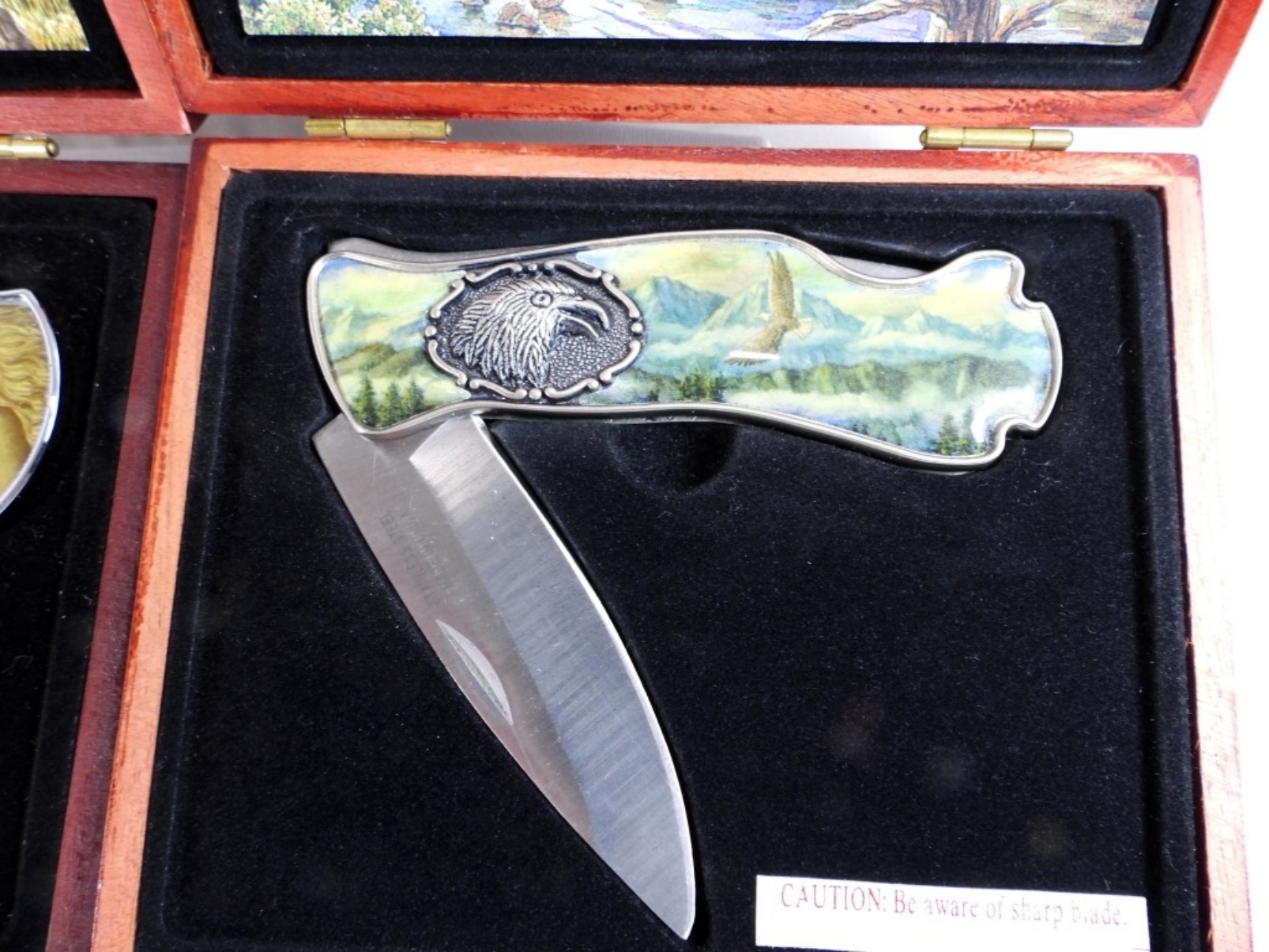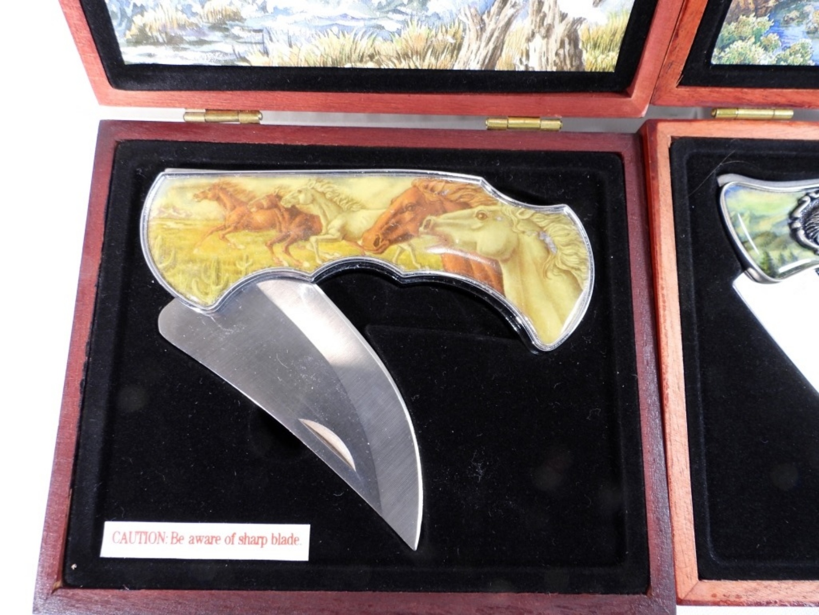2 COLLECTIBLE POCKET KNIVES, HORSE/EAGLE STYLE, BLADES 3”, KNIVES 7” ALL TOGETHER, BOTH KNIVES COME IN ORIGINAL BOXES