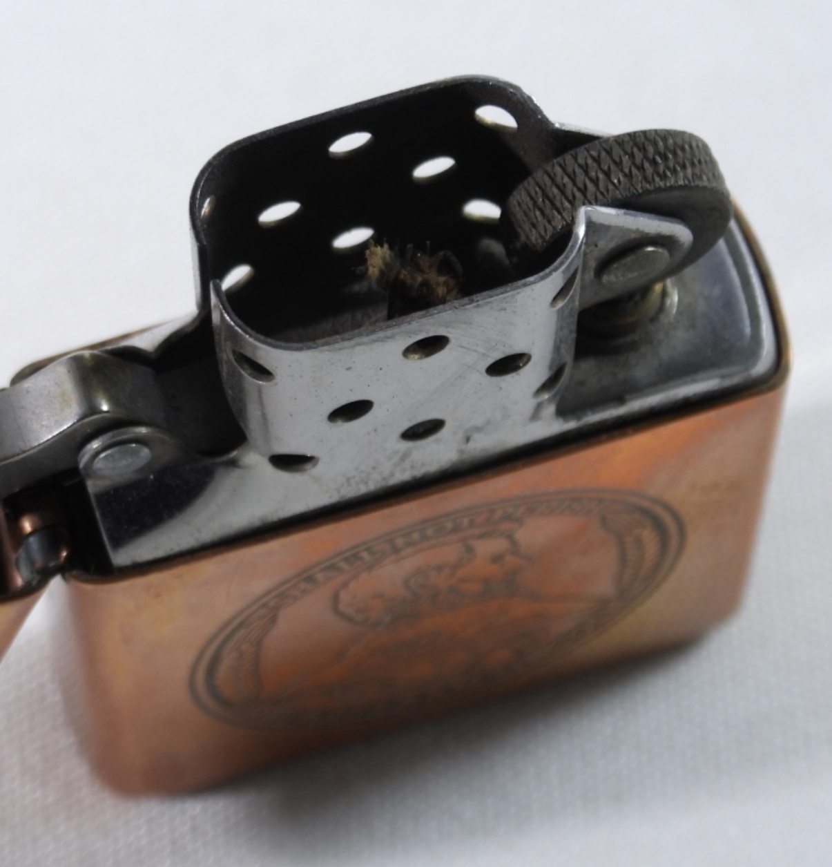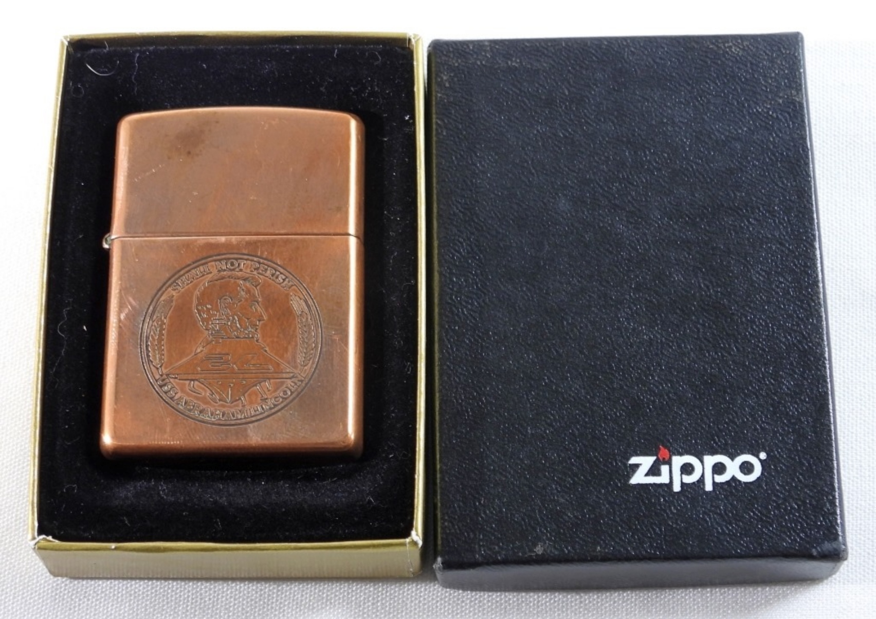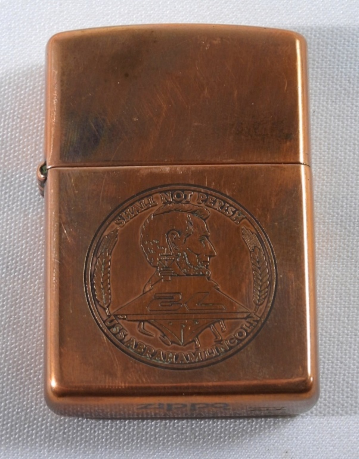 IN A ZIPPO BOX, 1998, FIRED, “SHALL NOT PERISH USS ABRAHAM LINCOLN” ETCHED ON THE FRONT WITH LINCOLN AND SHIP ON THE FRONT