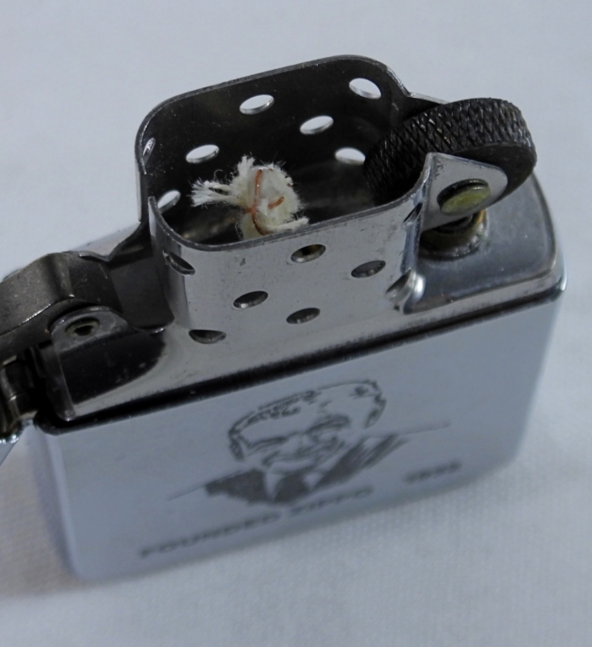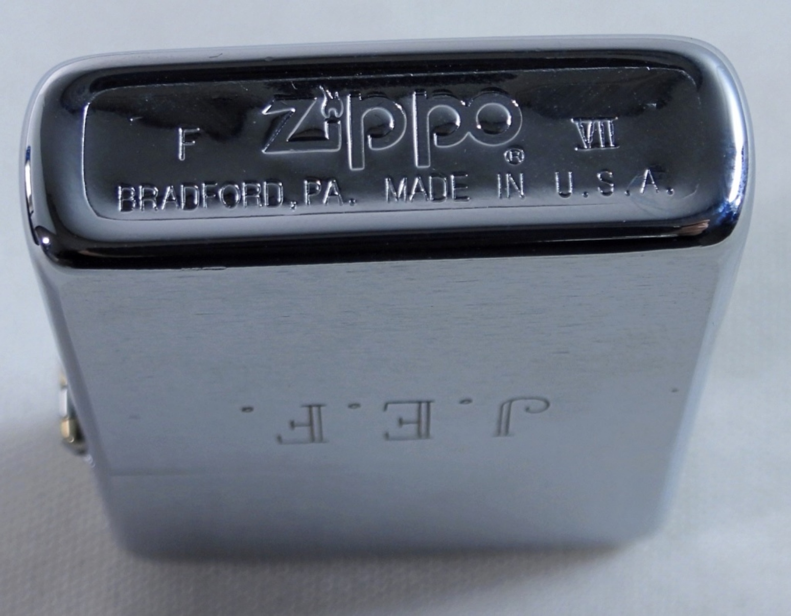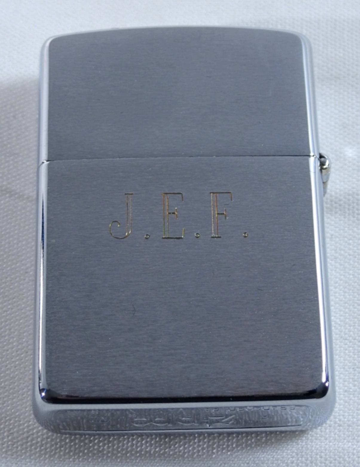 UNFRIED, IN VELVET ZIPPO CASE, ENGRAVED J.E.F ON THE BACK