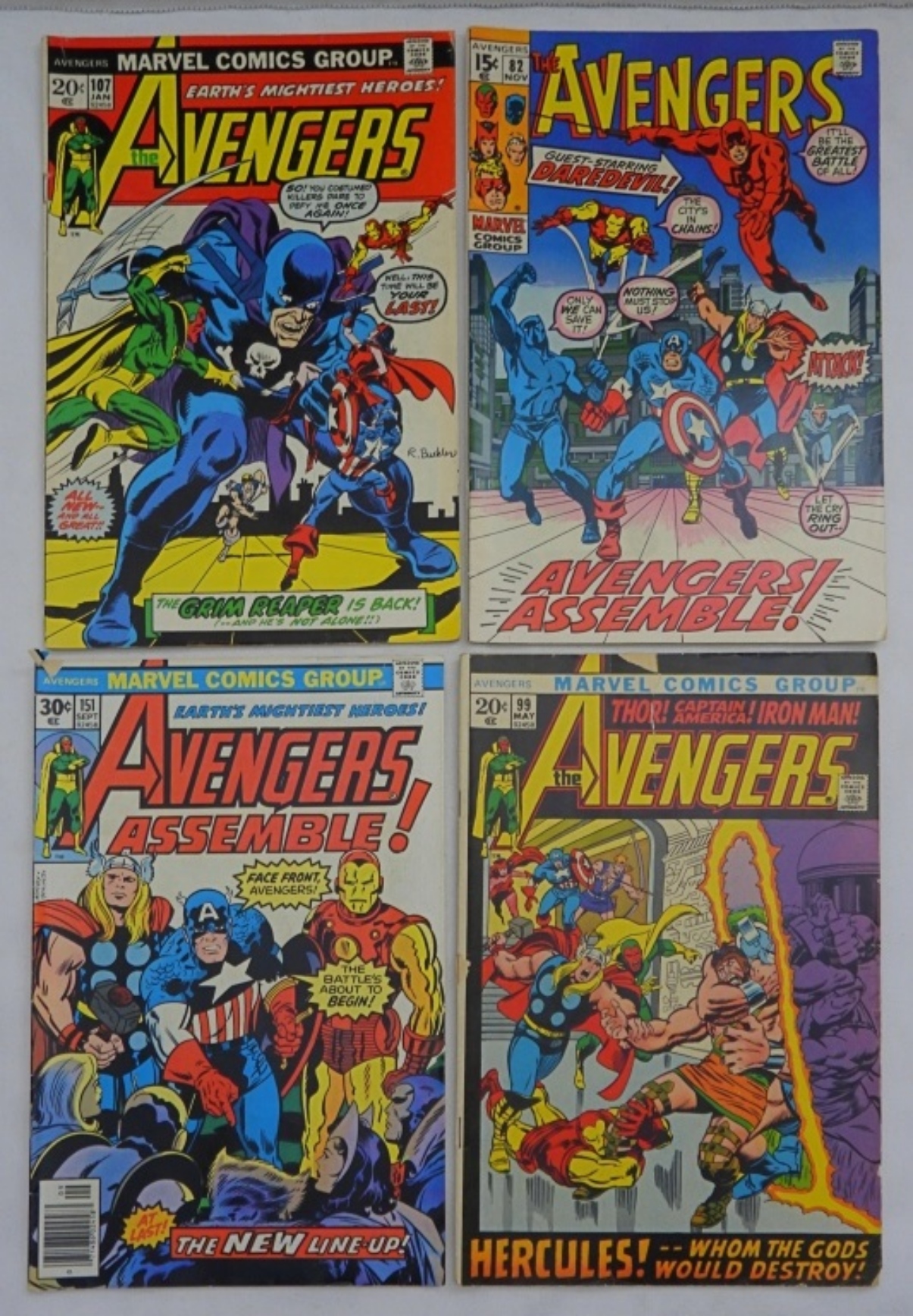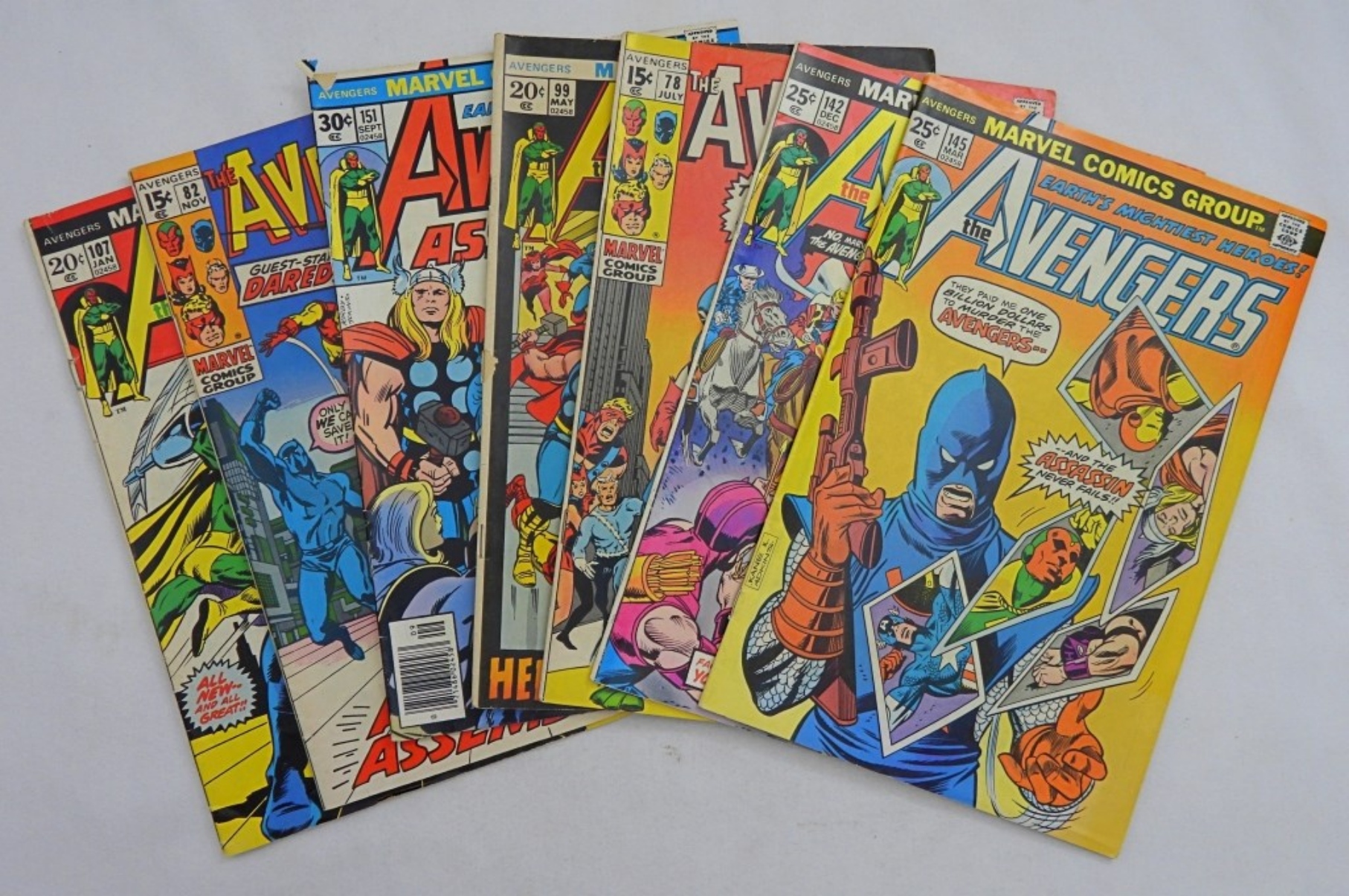 7 VARIETY MARVEL “THE AVENGERS” COMICS- 1973 VOL. 1 NO. 107 (GOOD), 1970 VOL. 1 NO. 82 (GOOD), 1976 VOL. 1 NO. 151 (GOOD), 1972 VOL. 1 NO. 99 (GOOD), 1970 VOL. 1 NO. 78 (GOOD), 1975 VOL. 1 NO. 142 (VG), 1976 VOL. 1 NO. 145