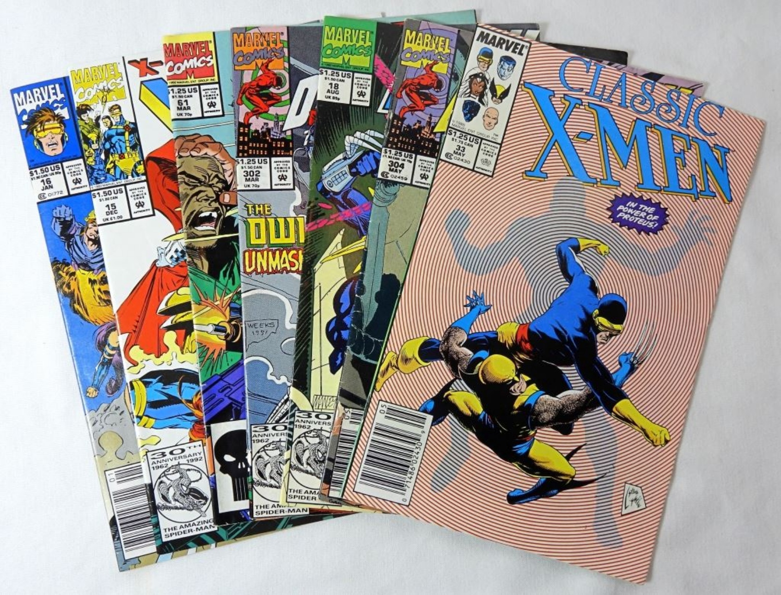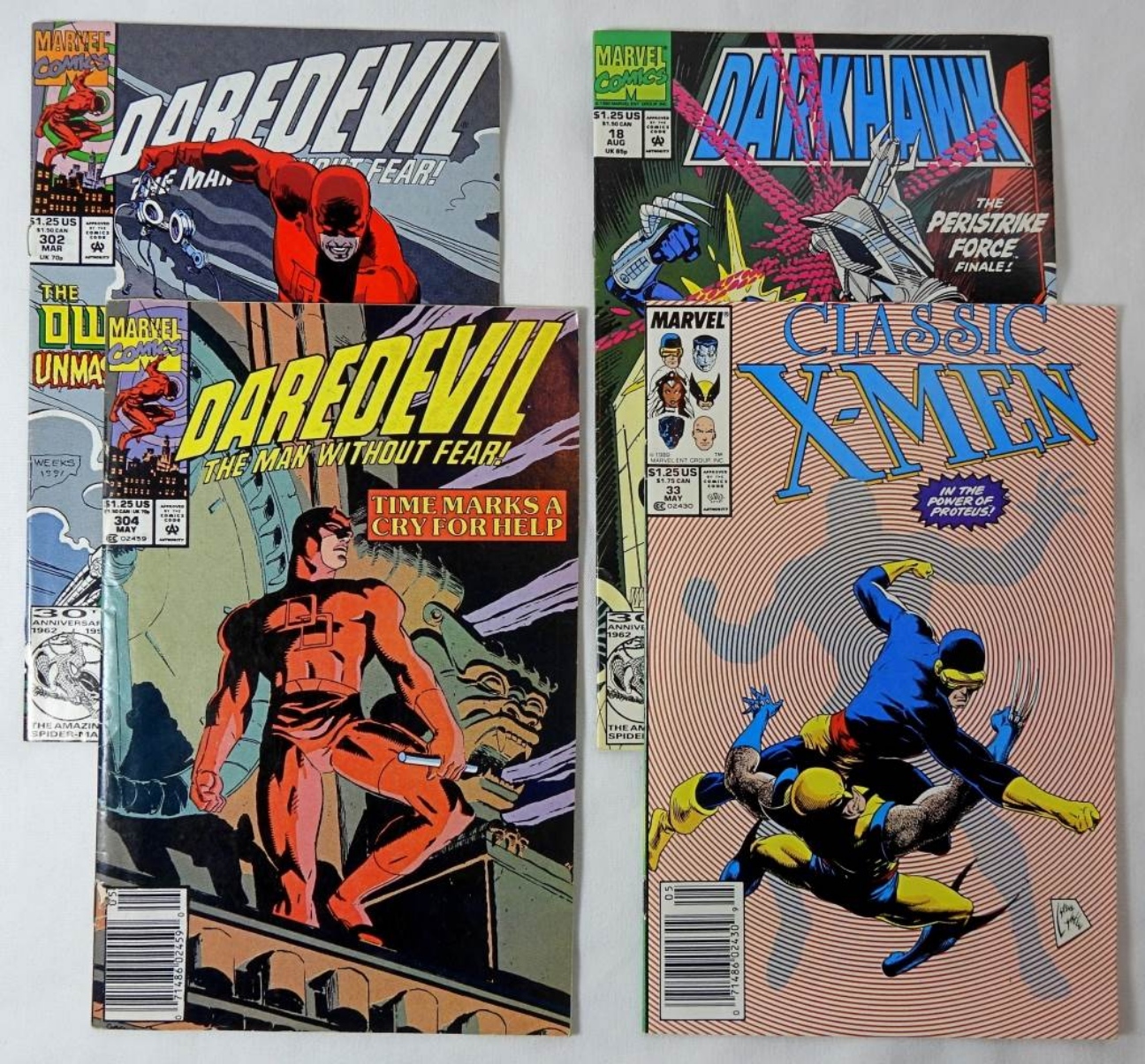 7- MARVEL COMICS- 1989-1993- MODERN- CLASSIC X-MEN-1989- NO 33. DAREDEVIL THE MAN WITHOUT FEAR-1992- NO 304. DARK HAWK- 1992- NO 18. DAREDEVIL THE MAN WITHOUT FEAR- 1992-NO 302. THE PUNISHER- 1992- NO 61. X-MEN- 1992- NO