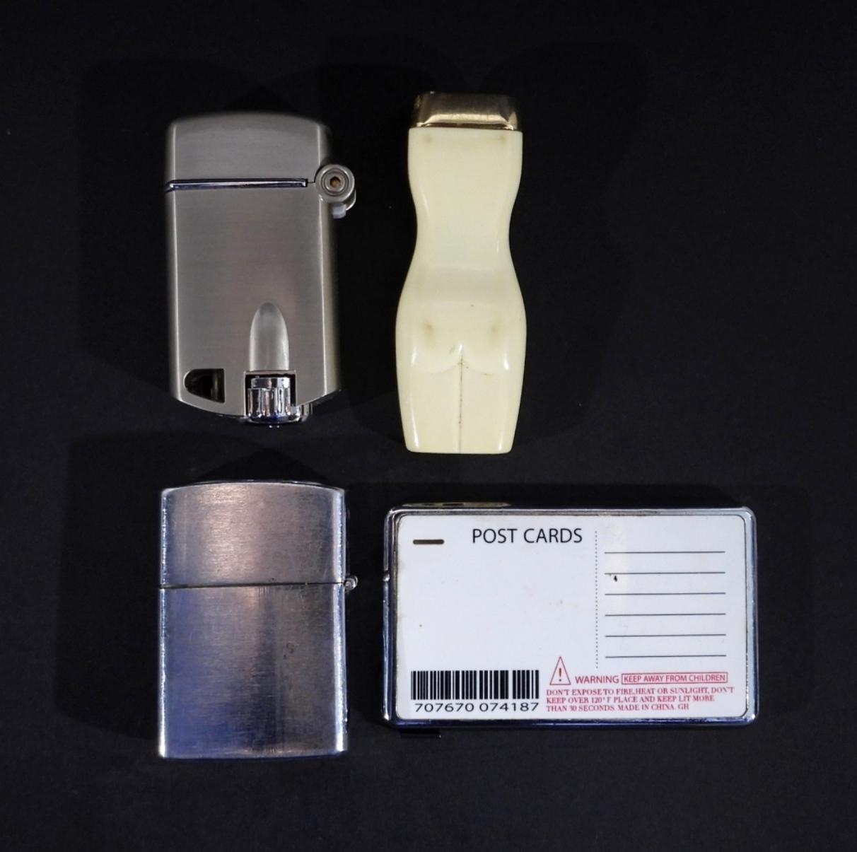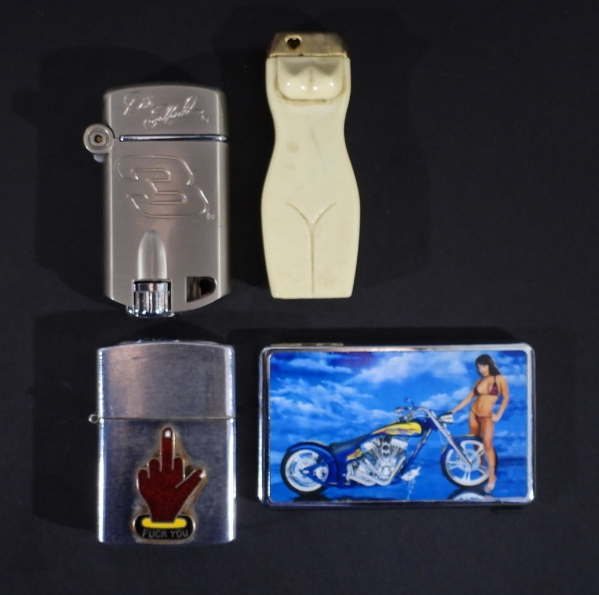 NASCAR DALE EARNHARDT #3 LIGHTER IN CASE. NAKED LADY SILHOUETTE LIGHTER. BIKINI LADY WITH MOTORCYCLE LIGHTER. SILVER “TOP” BRAND LIGHTER WITH F-YOU LOGO