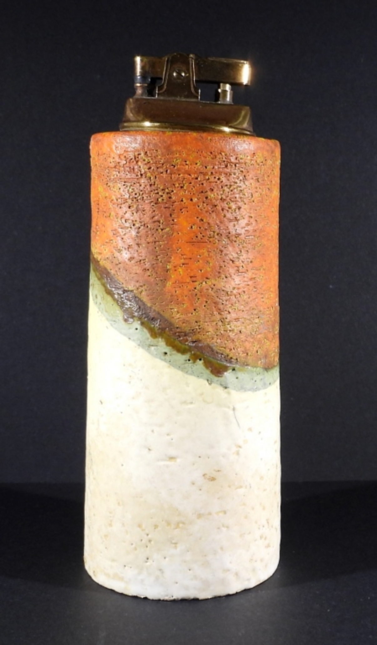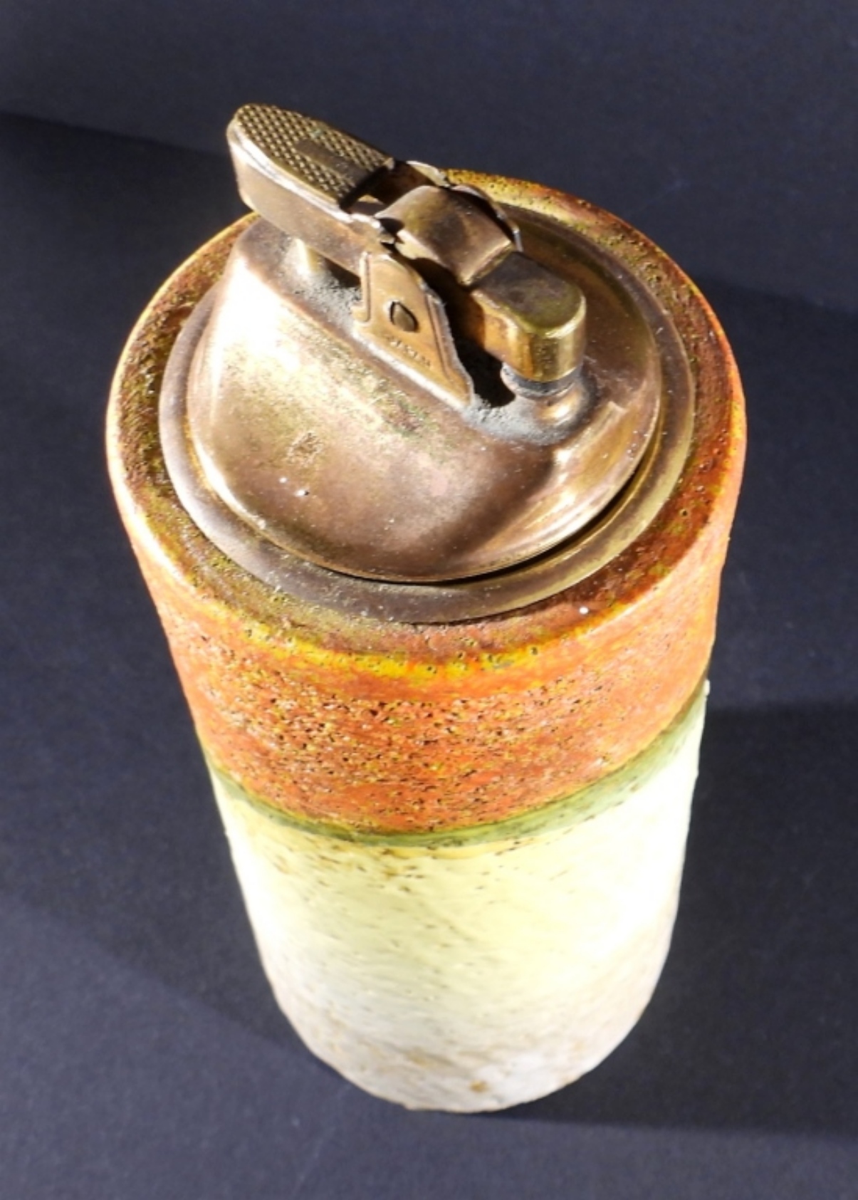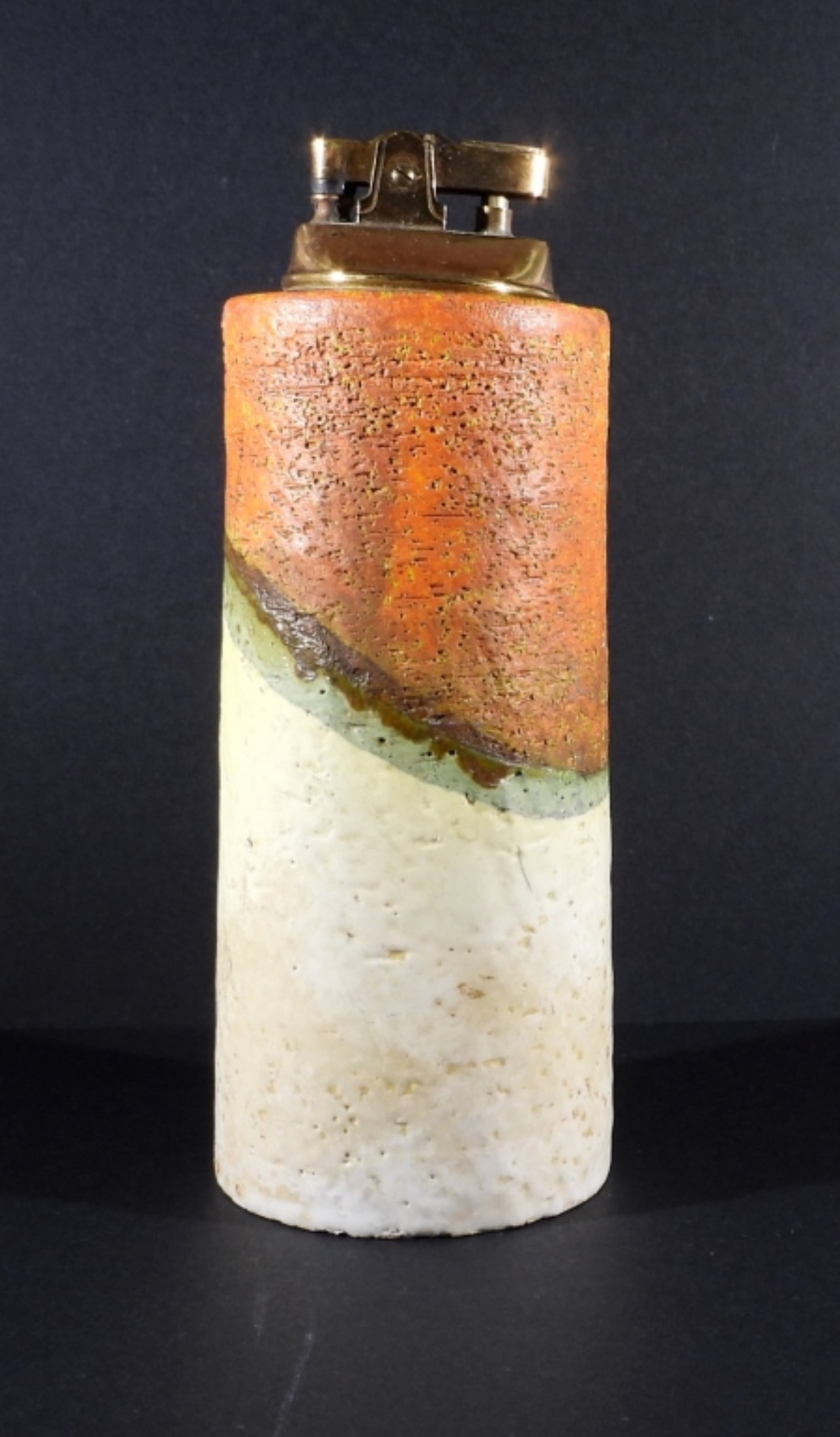 ITALIAN POTTERY TABLE LIGHTER, BOTTOM IS HAND SIGNED, 6″ TALL. RONSON MASTERCASE ART DECO LIGHTER & CIGARETTE CASE, WITH INSCRIPTION “CAPT. CHURCHILL”. 4.5″ TALL, 2.5″ WIDE.