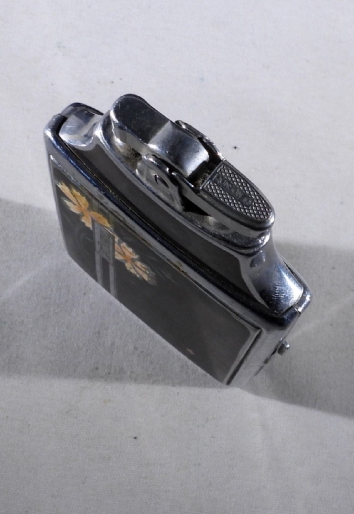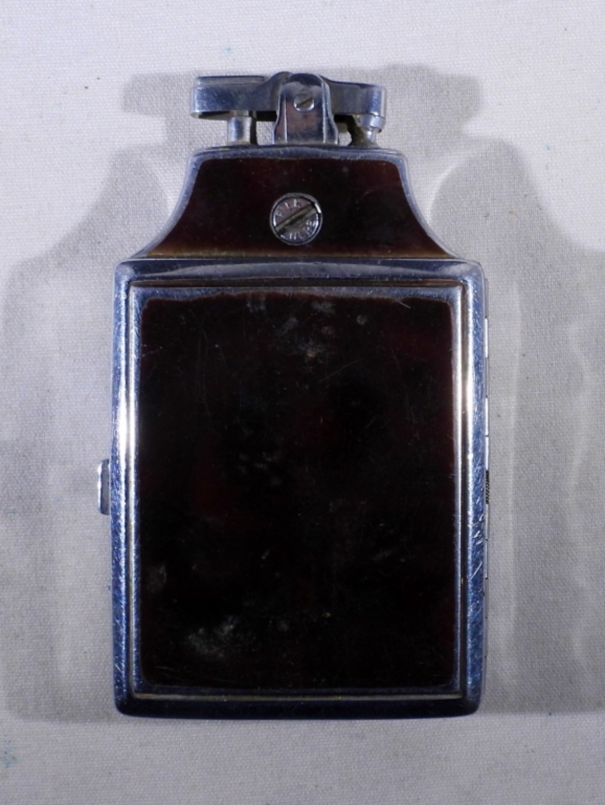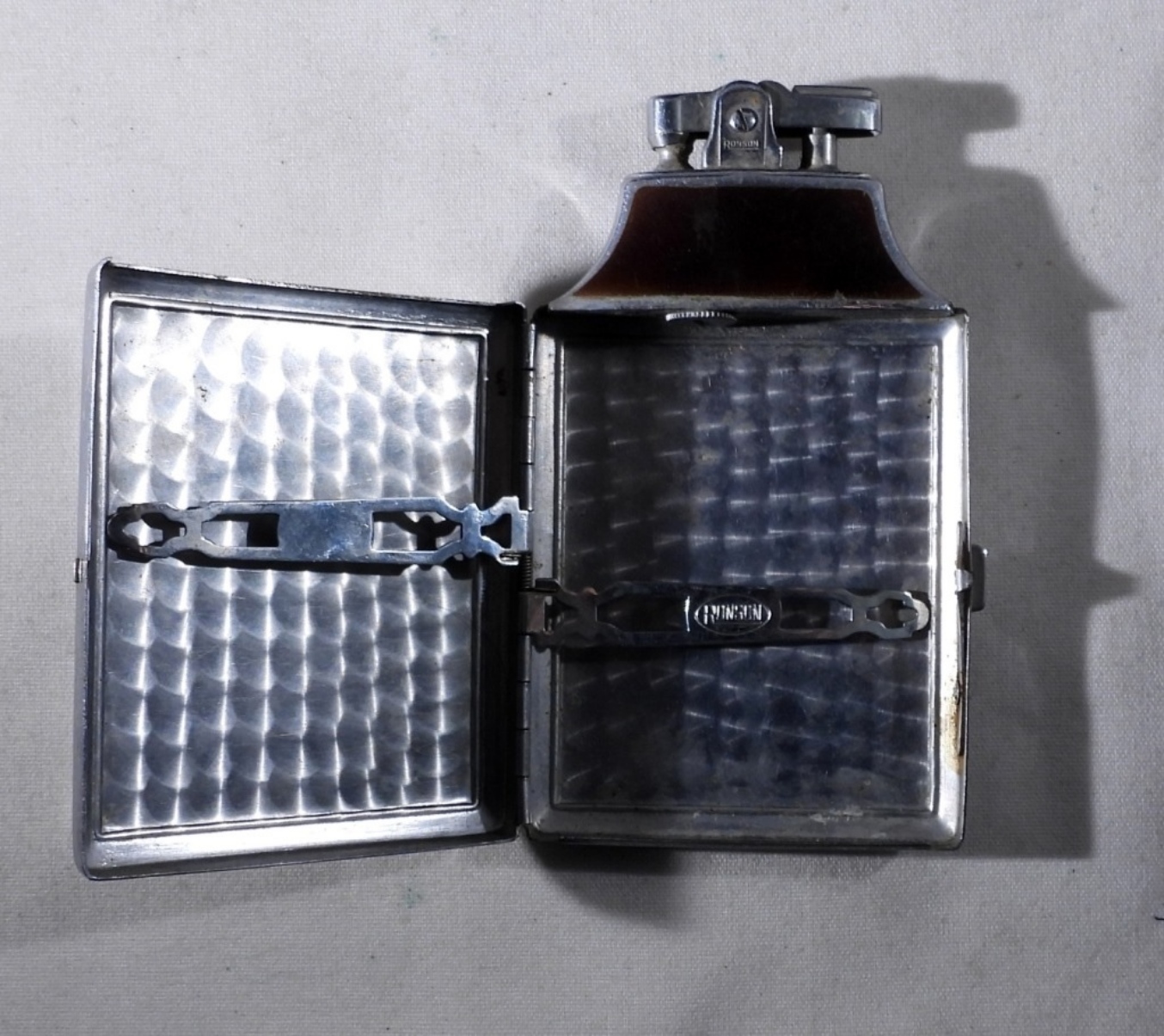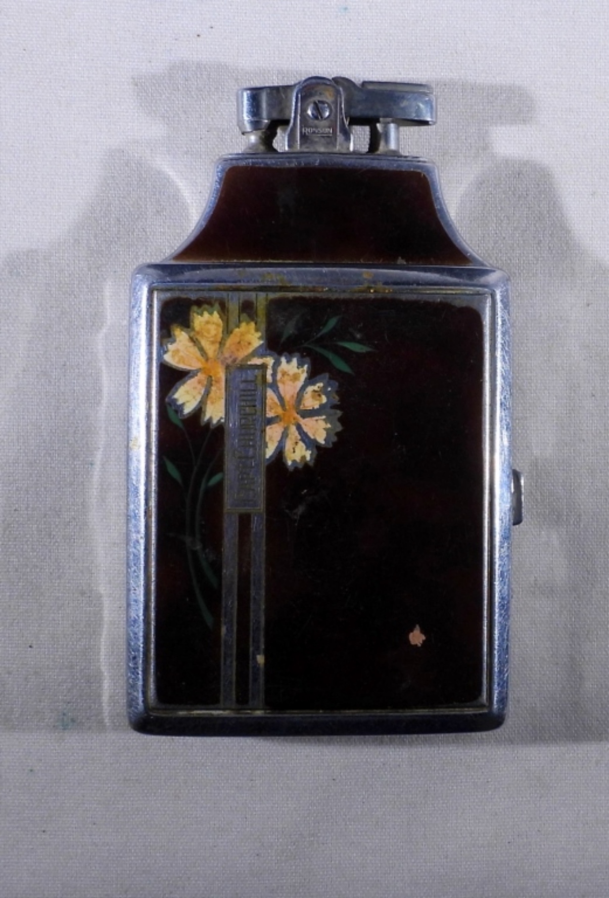 ITALIAN POTTERY TABLE LIGHTER, BOTTOM IS HAND SIGNED, 6″ TALL. RONSON MASTERCASE ART DECO LIGHTER & CIGARETTE CASE, WITH INSCRIPTION “CAPT. CHURCHILL”. 4.5″ TALL, 2.5″ WIDE.
