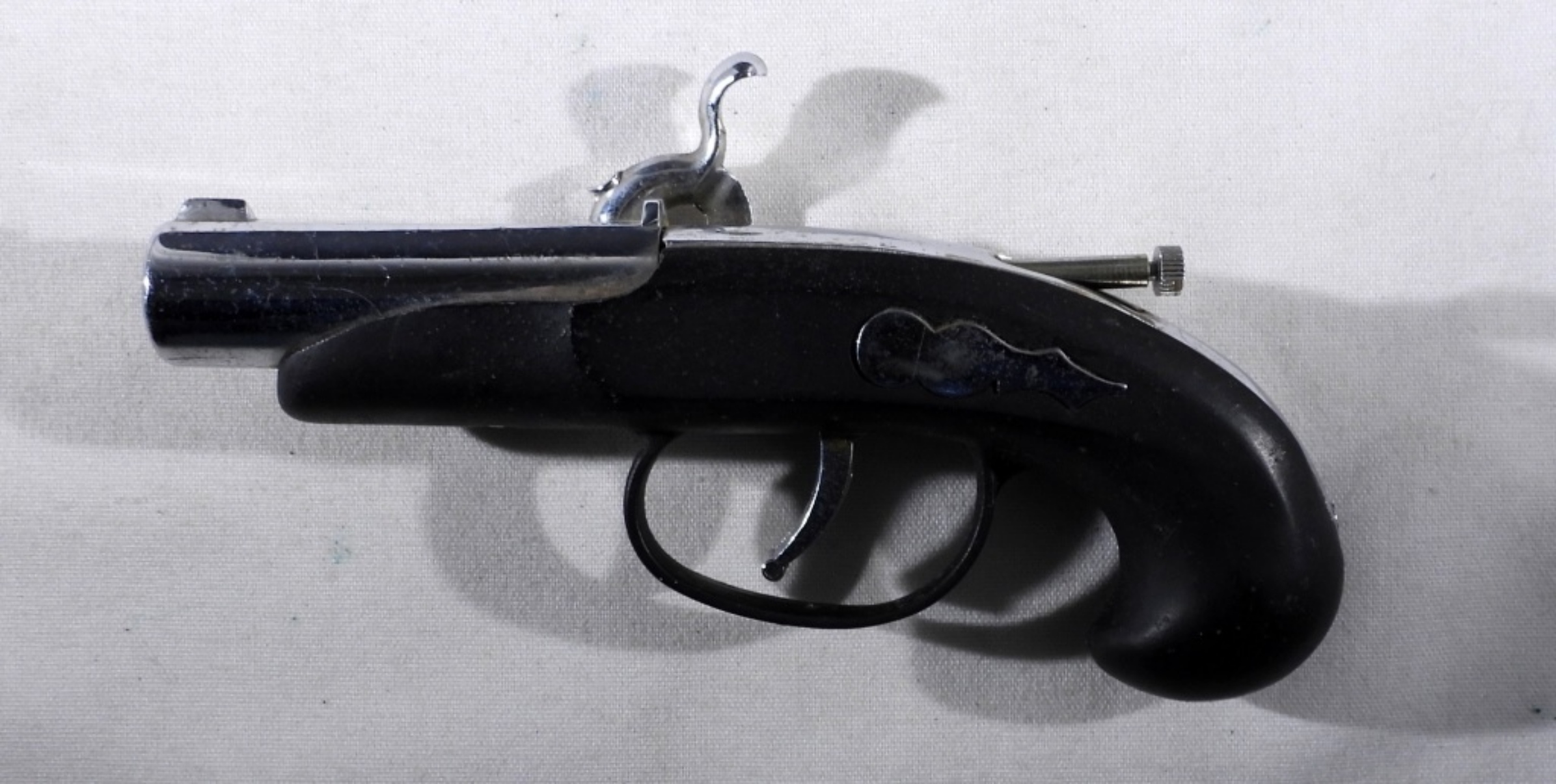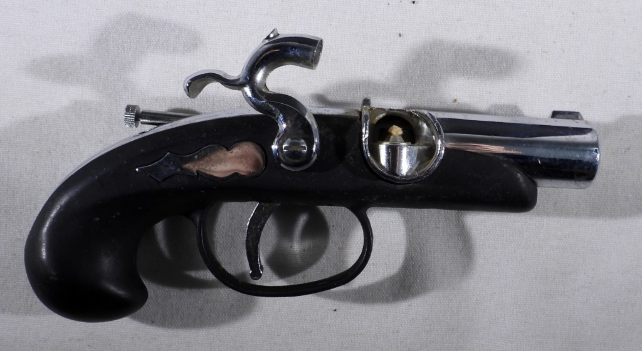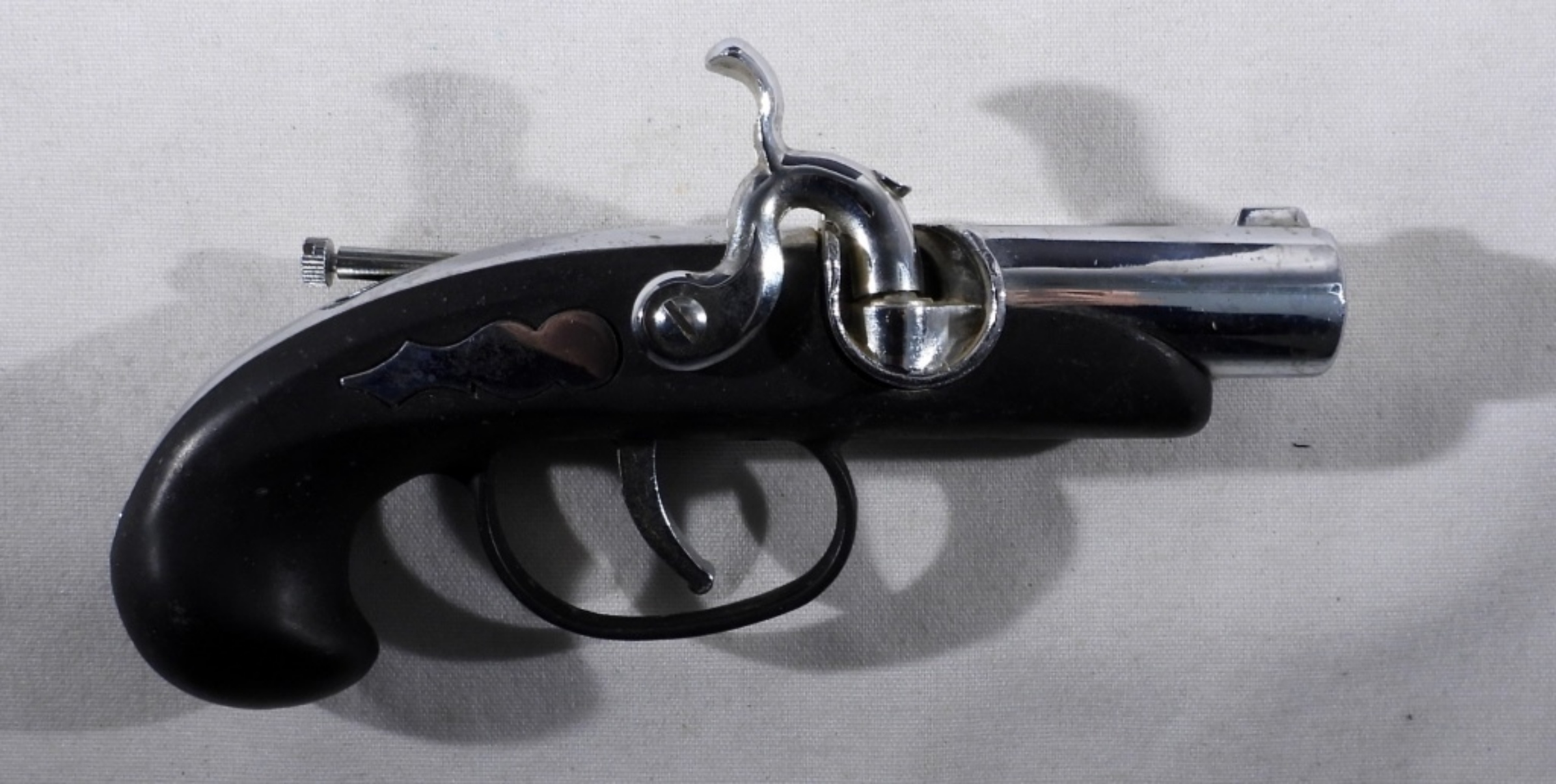 VINTAGE 1970’s NOVELTY FLINTLOCK PISTOL TABLE LIGHTER, JAPAN. 6″ LONG.