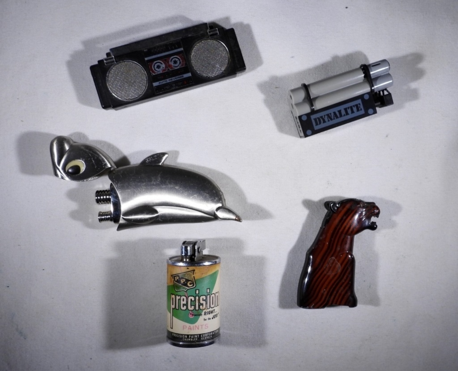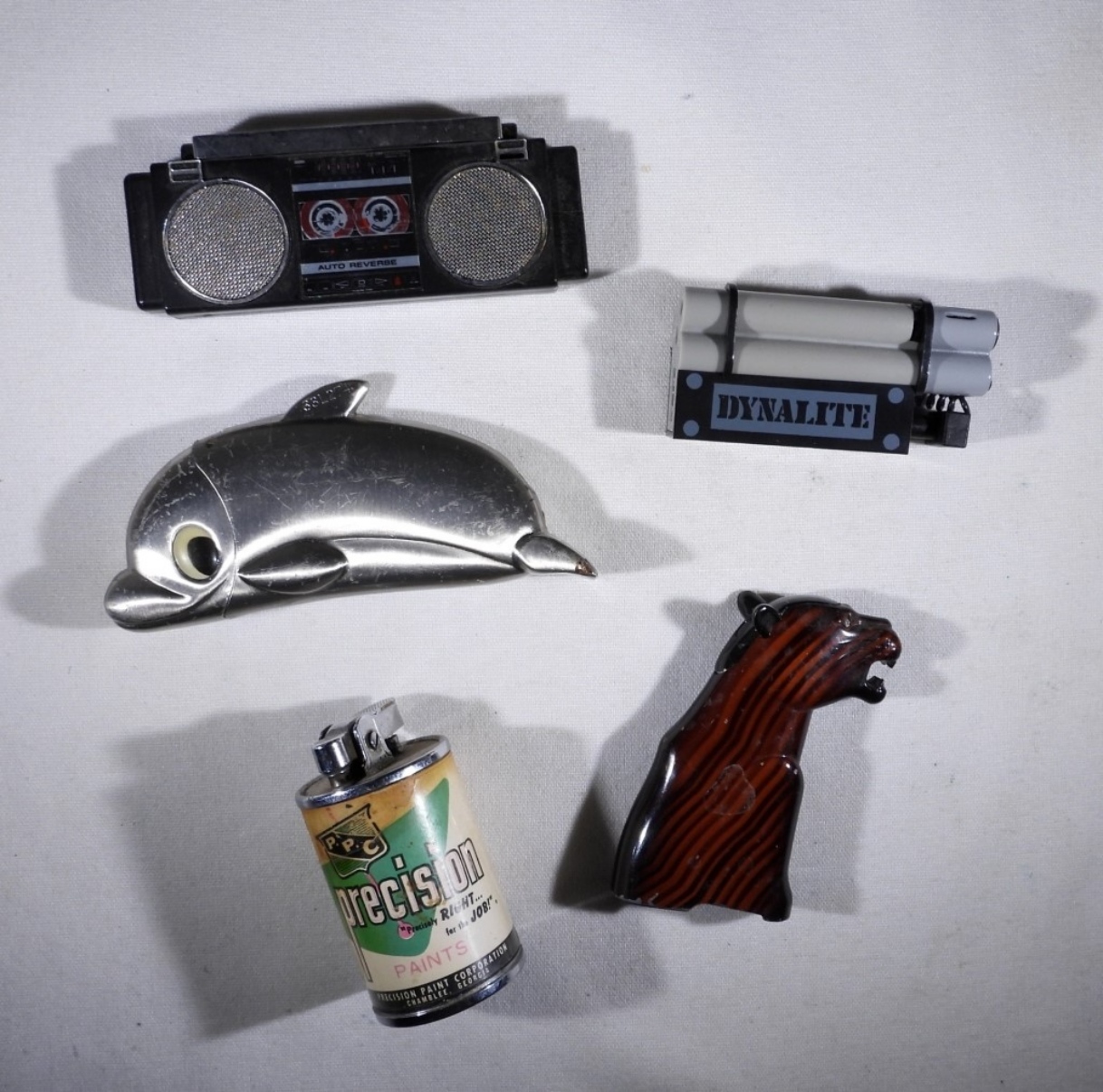 FIVE VINTAGE NOVELTY LIGHTERS. DOLPHIN, BOOMBOX, WILD CAT, DYNAMITE & PAINT CAN. SUPER CUTE.