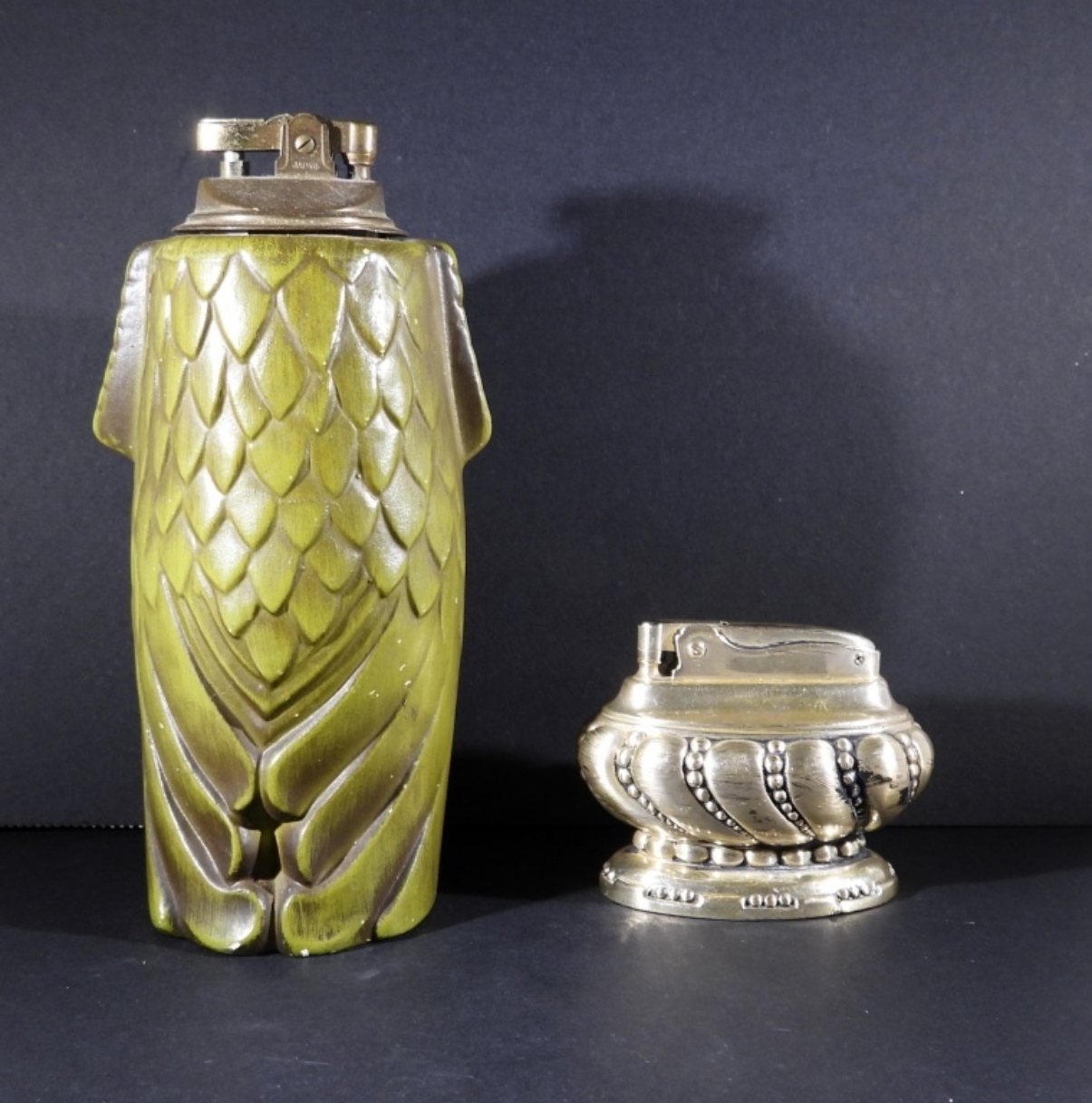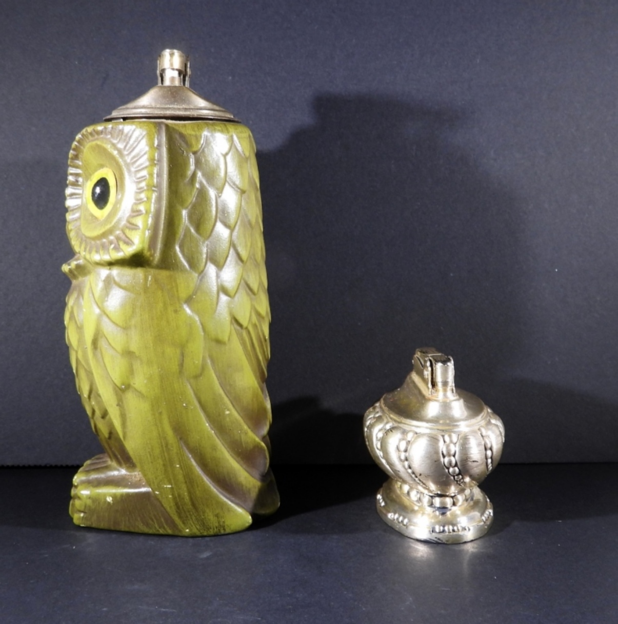 VINTAGE GREEN OWL TABLE LIGHTER, 6.5″ TALL. RONSON “CROWN” TABLE TOP LIGHTER, SILVER TONE. 2.5″ TALL.