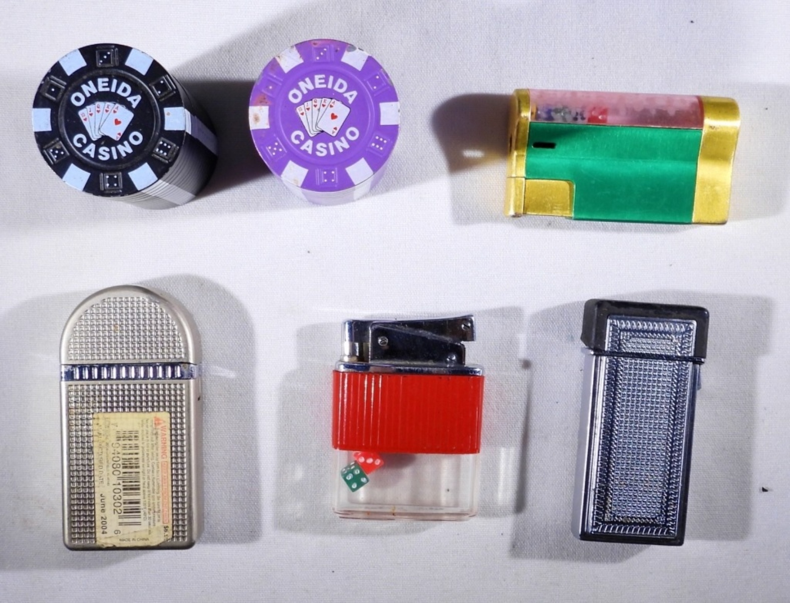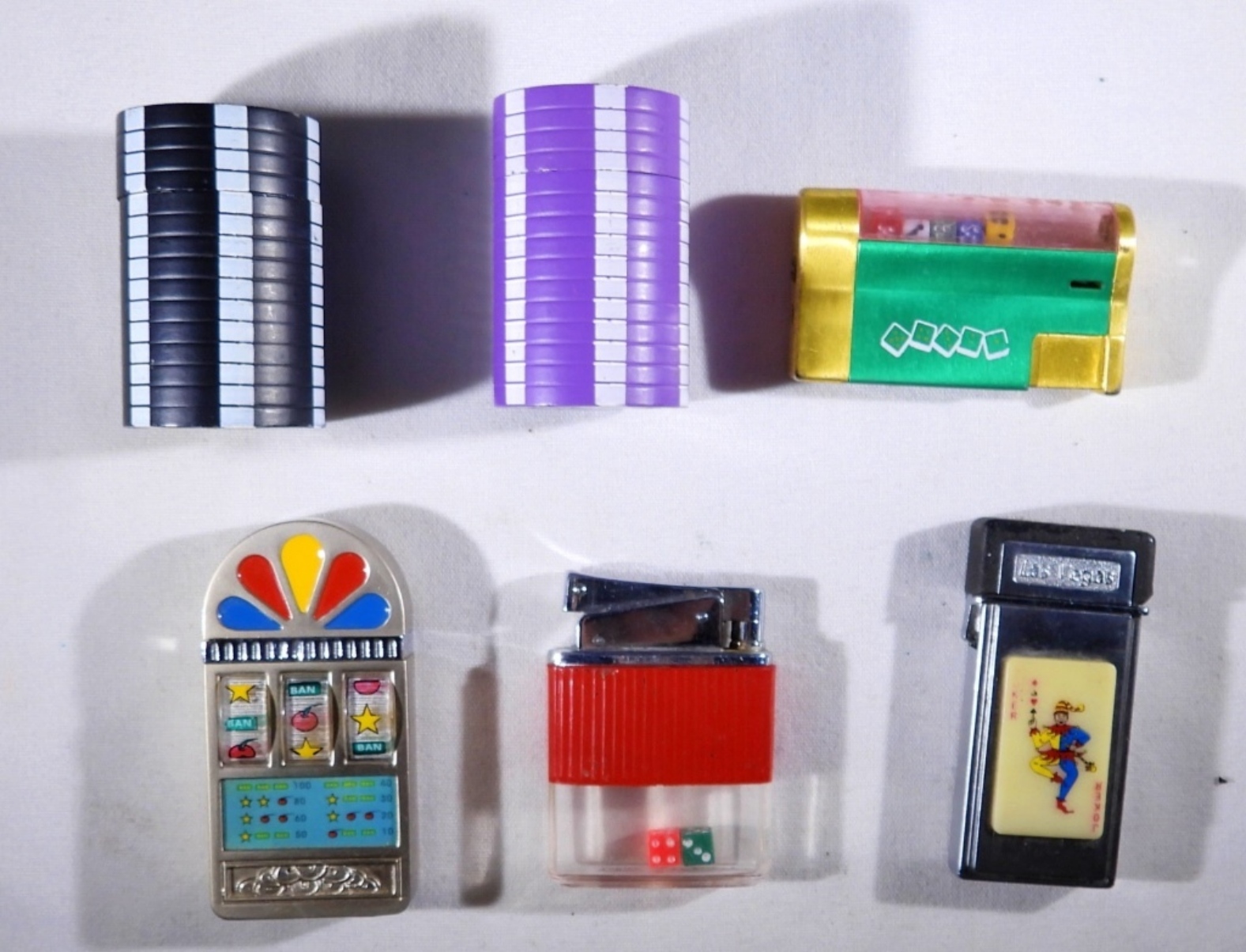 SIX LIGHTERS, CASINO CHIPS, DICE, CARDS, SLOT MACHINE.