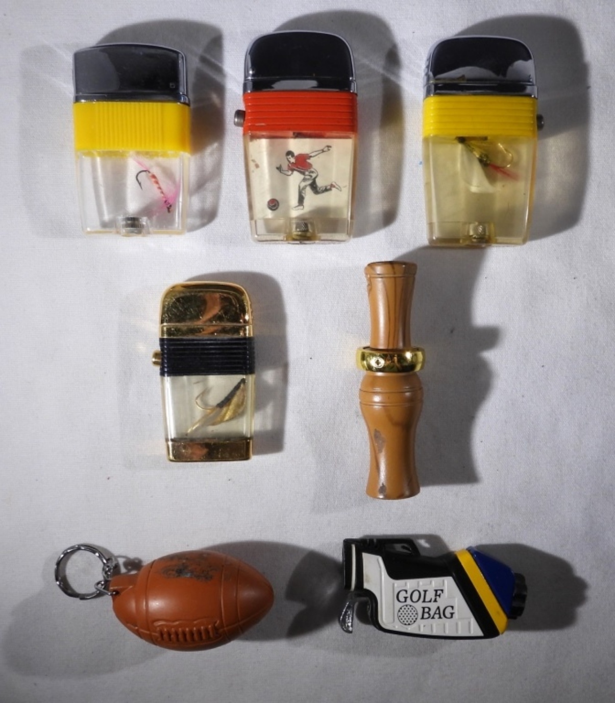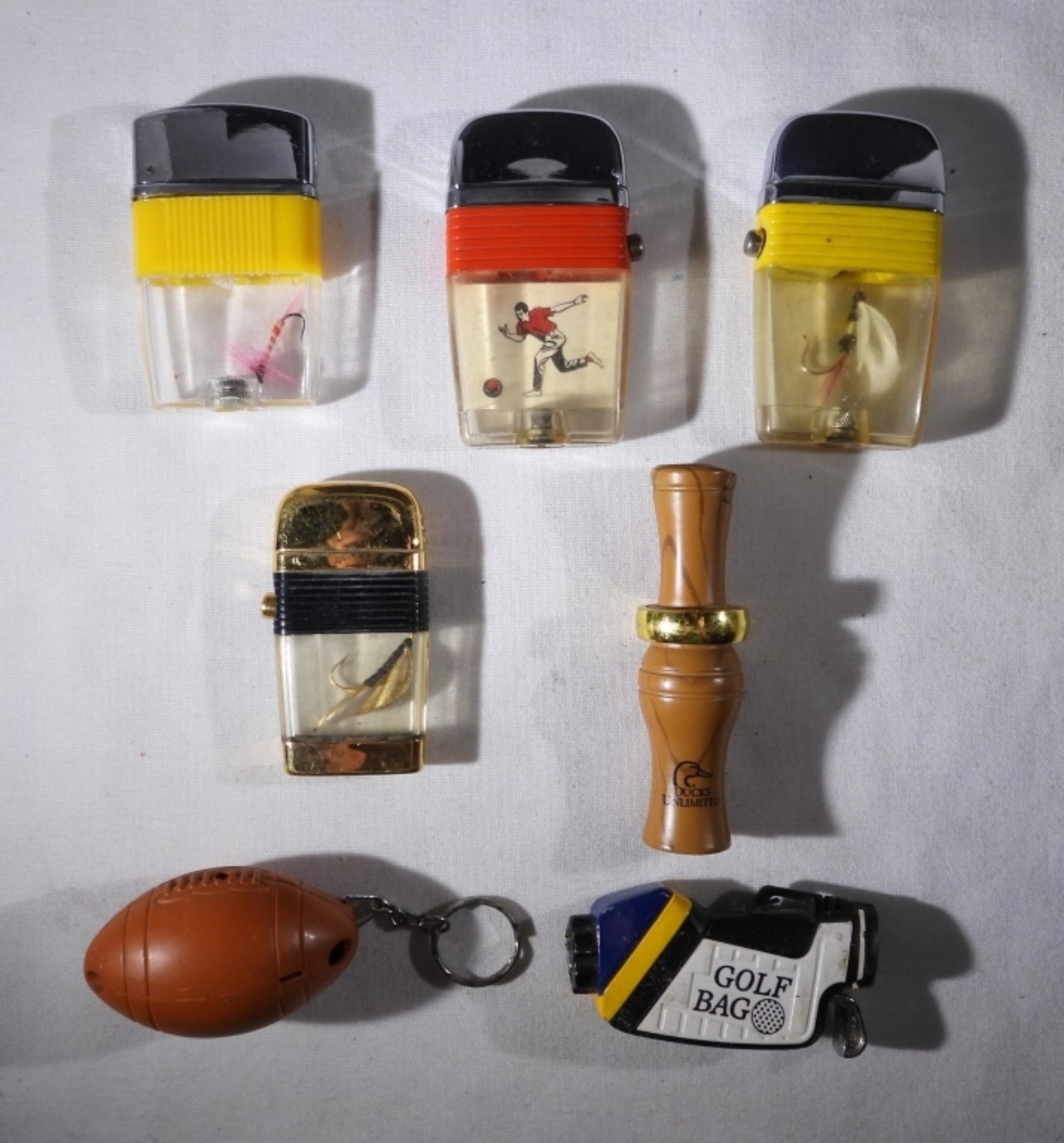 SEVEN VINTAGE LIGHTERS. BOWLING, GOLF, FOOTBALL, FISHING & DUCK CALL.