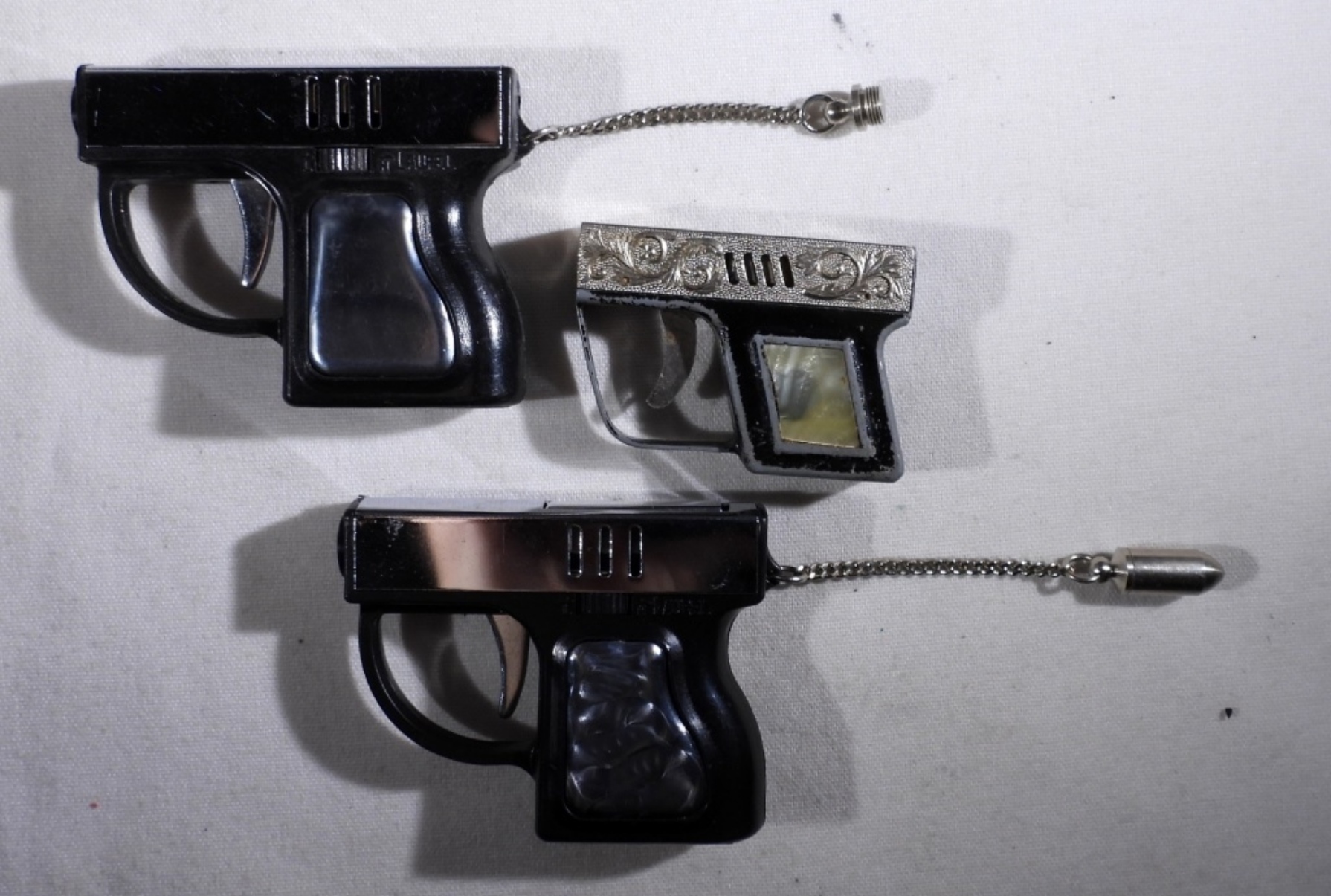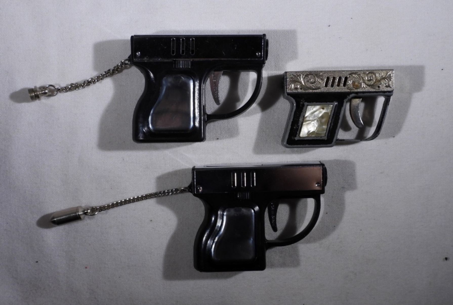 THREE PISTOL SHAPED VINTAGE LIGHTERS. ONE IN IT’S ORIGINAL BOX.