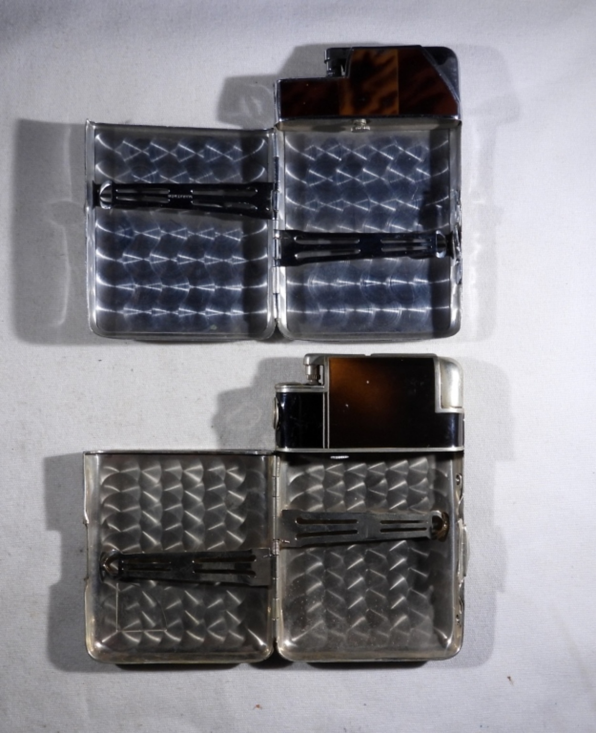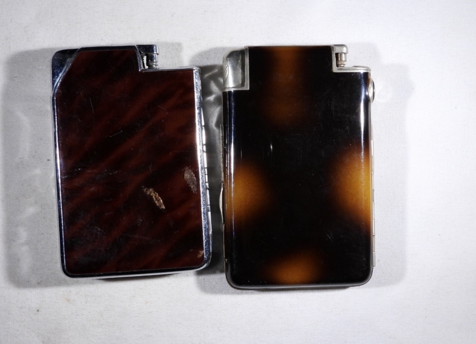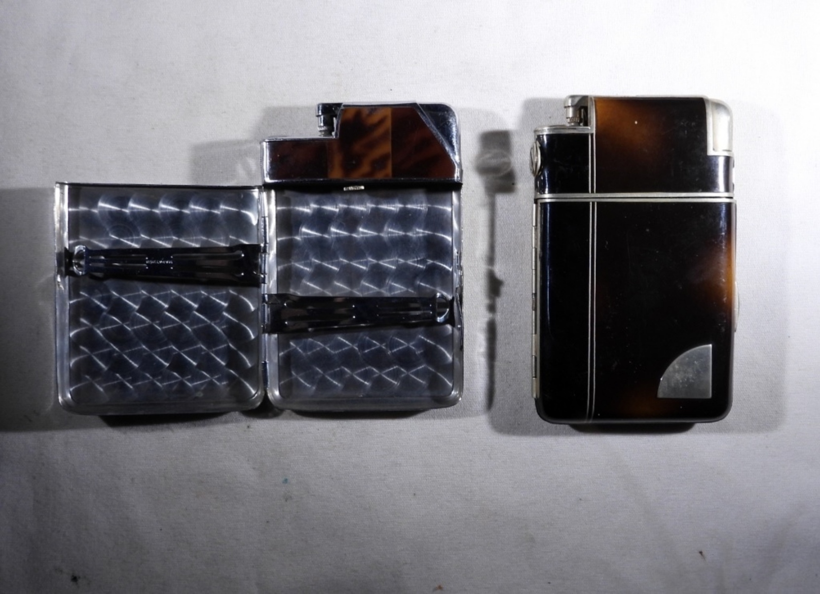 VINTAGE MARATHON ART DECO “SLIDE-A-LITE” CIGARETTE CASE & LIGHTER. 4.5″ TALL, 3″ WIDE. TORTOISE SHELL ENAMEL FINISH CIGARETTE HOLDER & LIGHTER, RONSON MASTERCASE. THIS ONE DOES NOT CLOSE, THE LATCH IS BROKEN. CIRCA