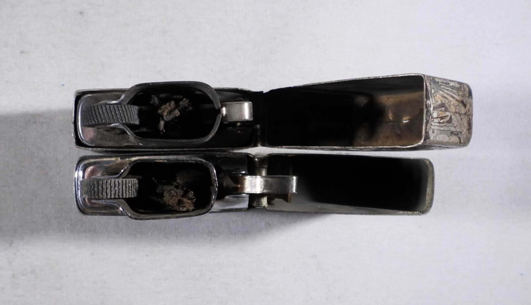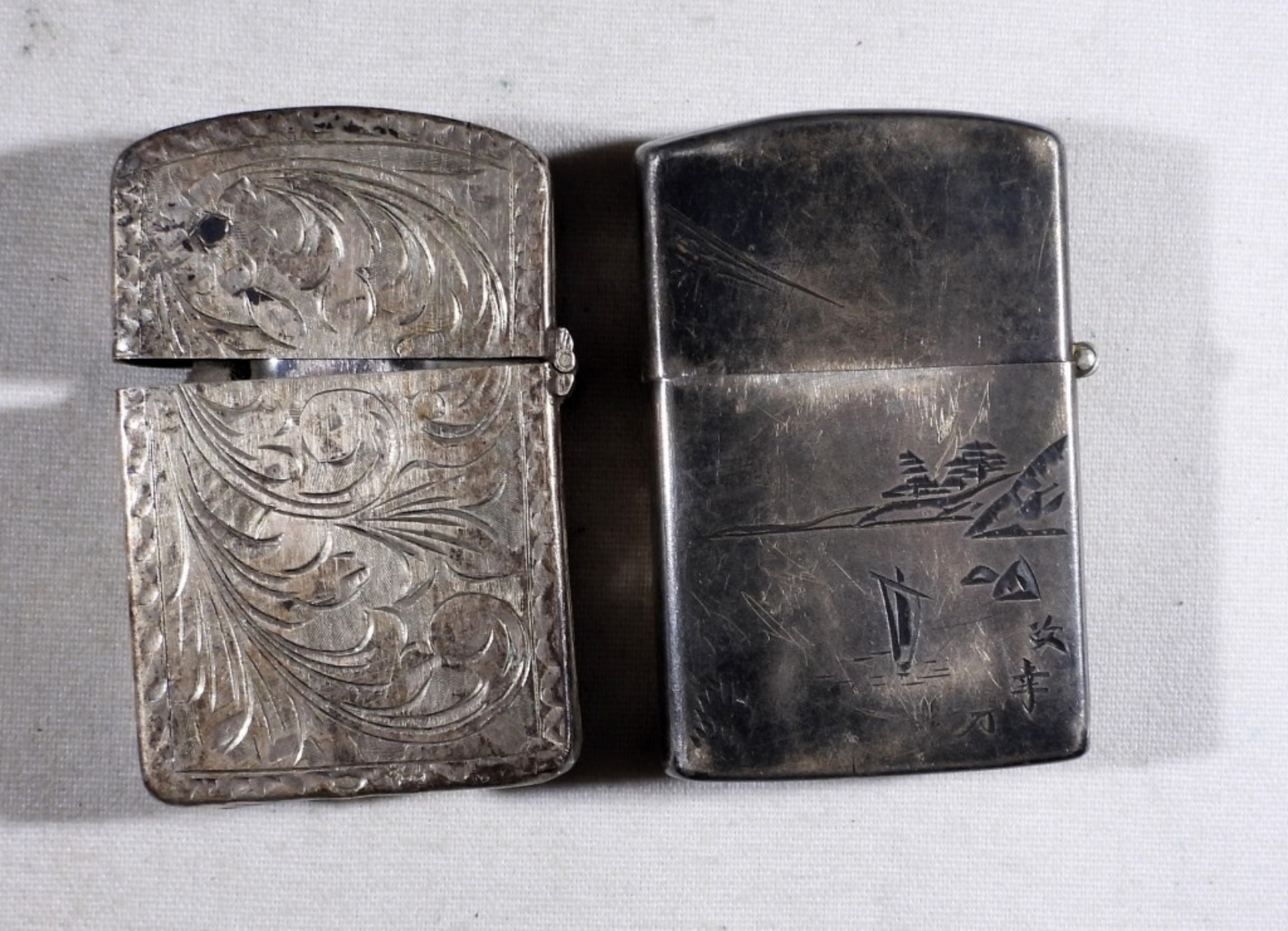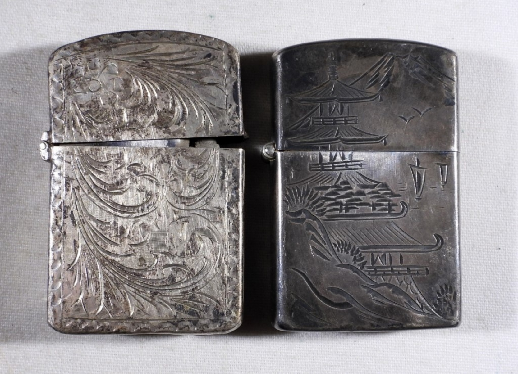 TWO STERLING SILVER LIGHTER CASINGS. ONE INSERT IS ZIPPO, ONE IS NOT. ETCHED ASIAN SCENE & ETCHED FLORAL SCENE HAS A LOOSE HINGE & THE ZIPPO INSERT. (28.7 DWT – CASES ONLY)