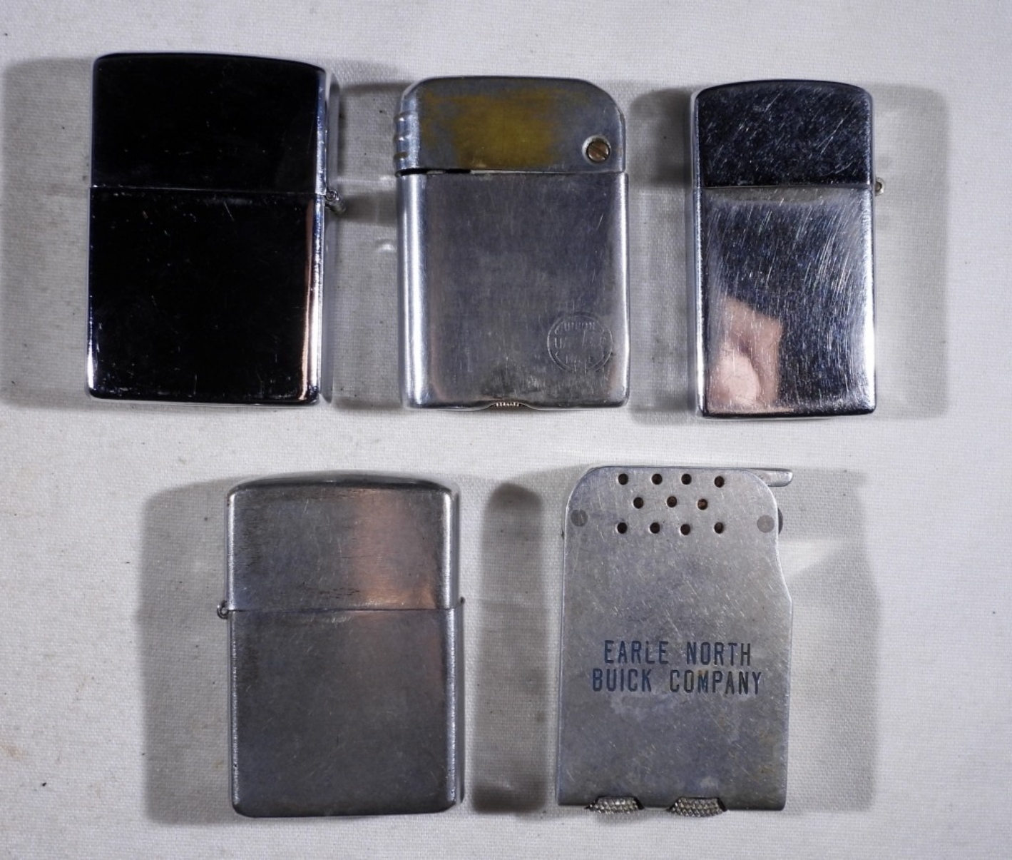 FIVE VINTAGE SILVER TONE ADVERTISEMENT LIGHTERS. BEACON BUFFALO DUB-L-ITE (1940’s). BOWERS, PARK, HI-LITE, ARIRANG.
