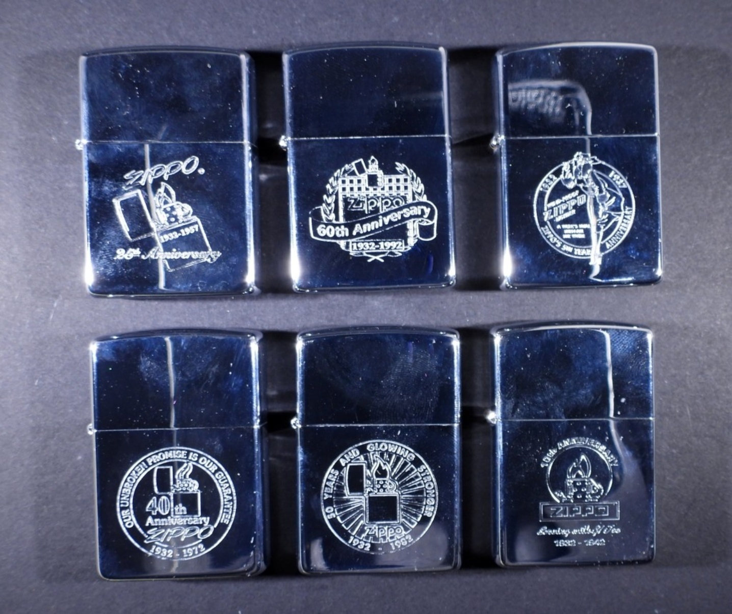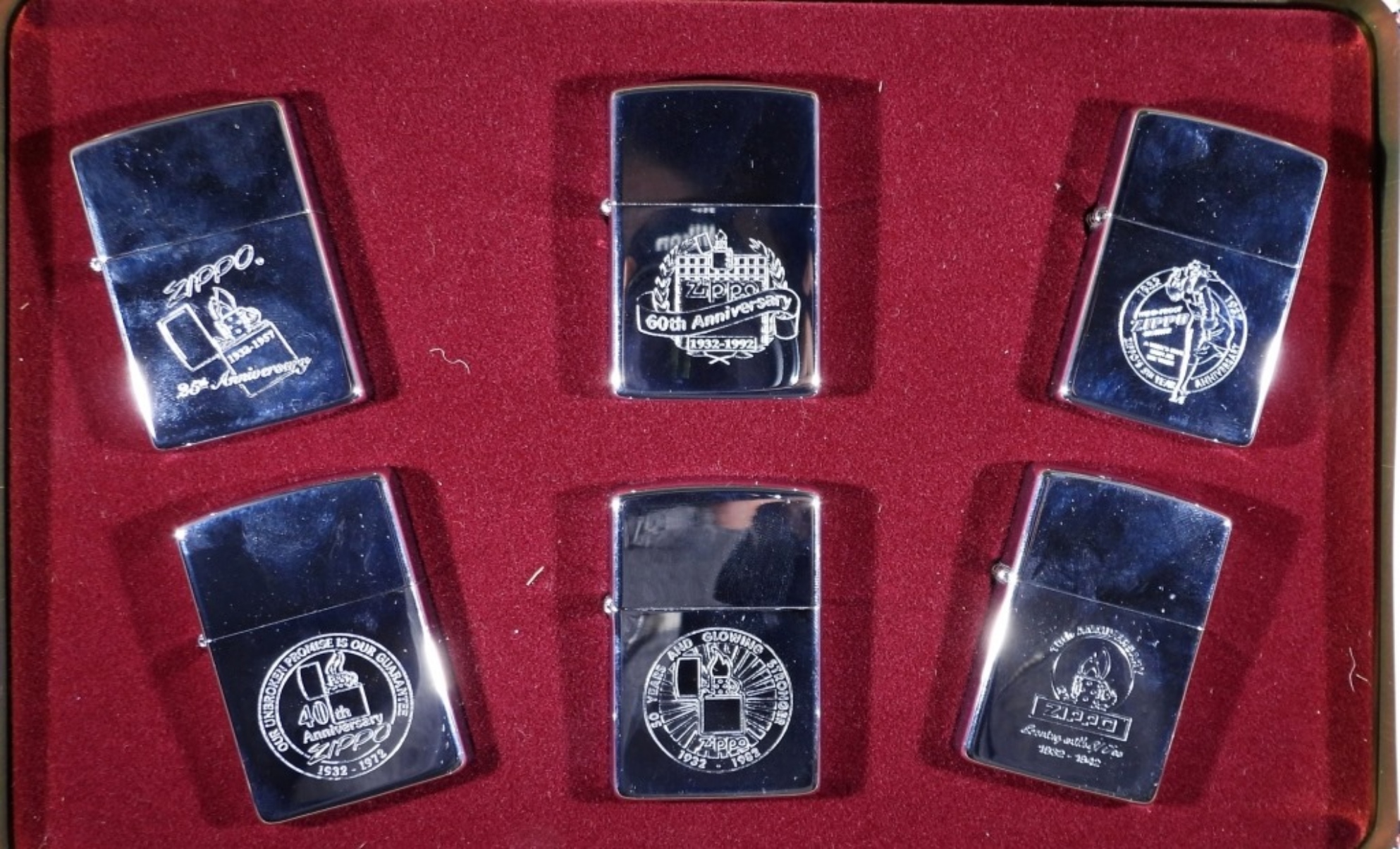 6 UNFIRED ZIPPOS IN THIS SET IN ITS ZIPPO ANNIVERSARY SERIES 1932-1992 COLLECTORS’ EDITION TIN CASE, DOES COMES WITH THE PINS AS WELL FROM THE SET SEALED.