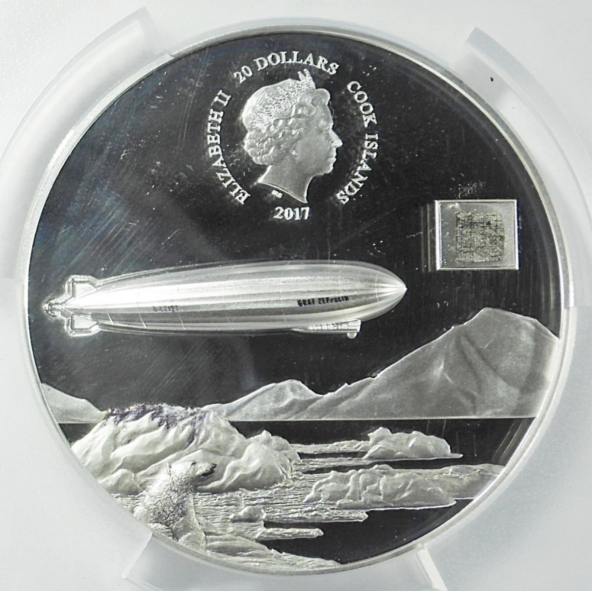 FIRST DAY OF ISSUE, GRAF ZEPPELIN SILVER. 3oz .999 SILVER WITH SWATCH OF AIRSHIP FABRIC.