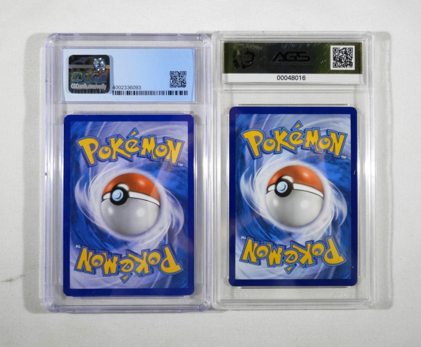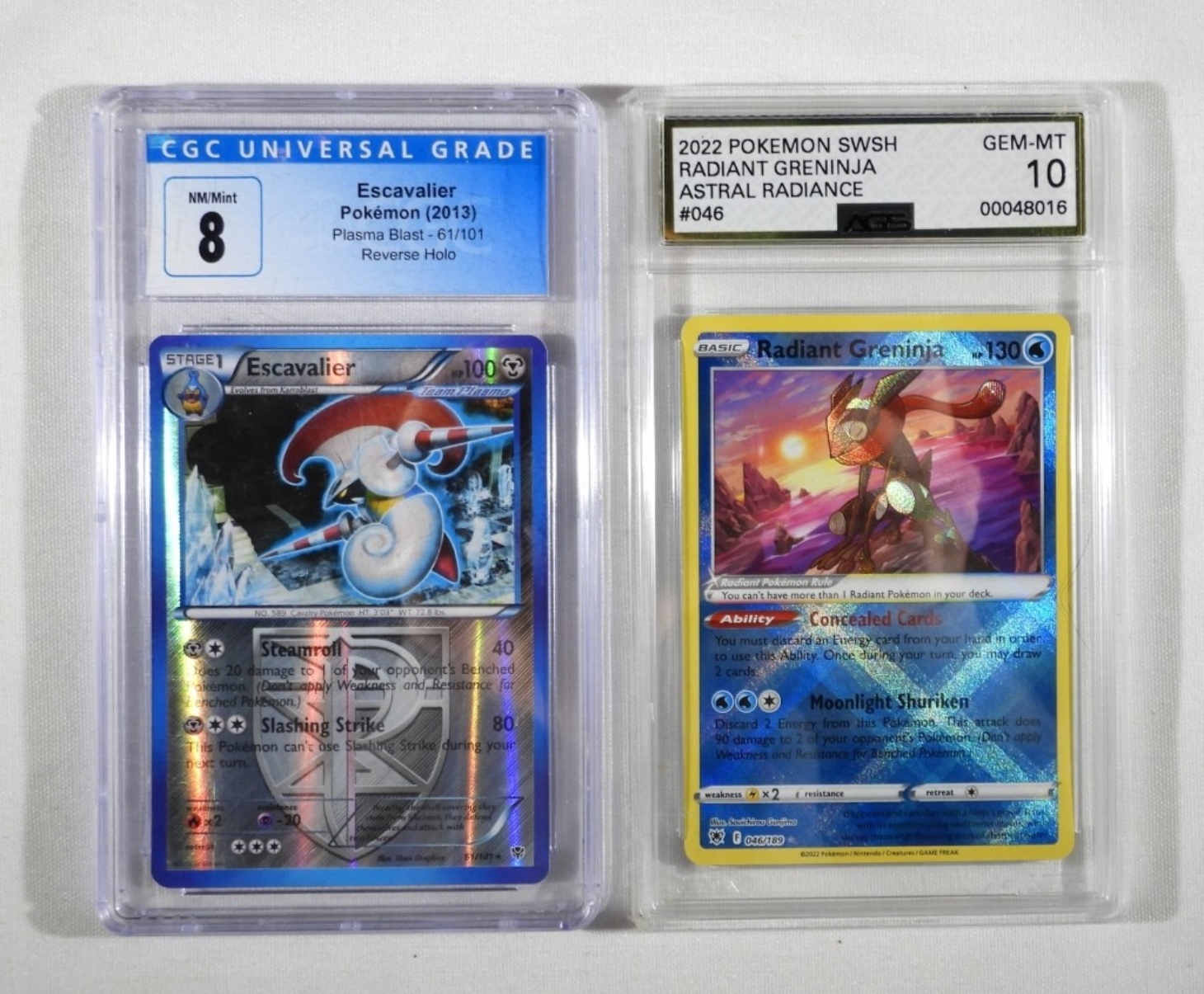 TWO GRADED POKEMON CARDS. 2022 SWORD SHIELD RADIANT GRENINJA ASTRAL RADIANCE #046. AGS GRADED, GEM-MT 10. ESCAVALIER POKEMON 2013 PLASMA BLAST 61/101 REVERSE HOLO. CGC GRADED NM/MINT 8.