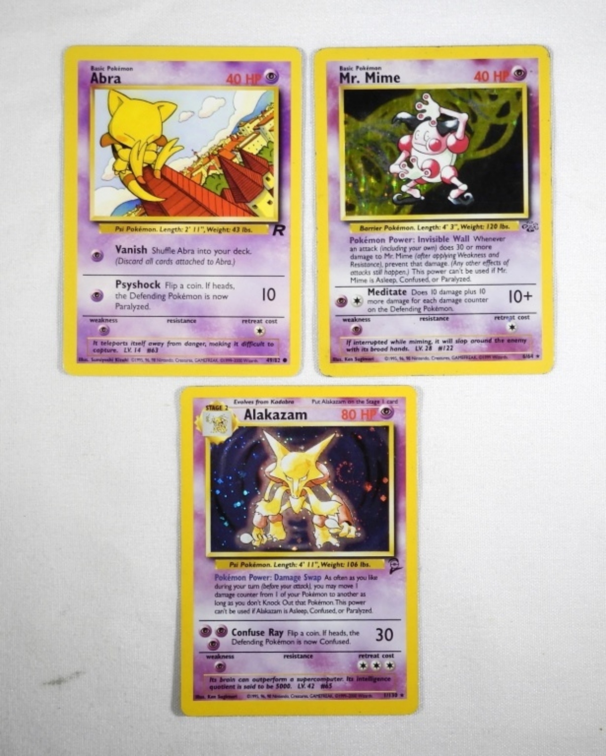 ALAKAZAM BASE CARD REVERSE HOLO WITH SWIRL! 1/130, 2000 BASE SET -NM/M. MR. MIME REVERSE HOLO 6/64 -USED CARD, SCRATCHED & WORN EDGES. PLAIN ABRA 49/82 2000 -NM/M.