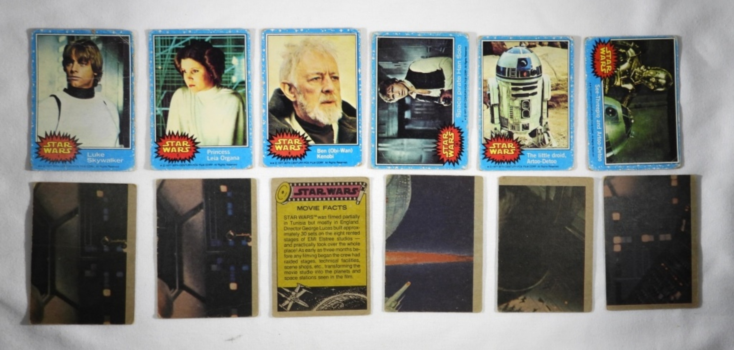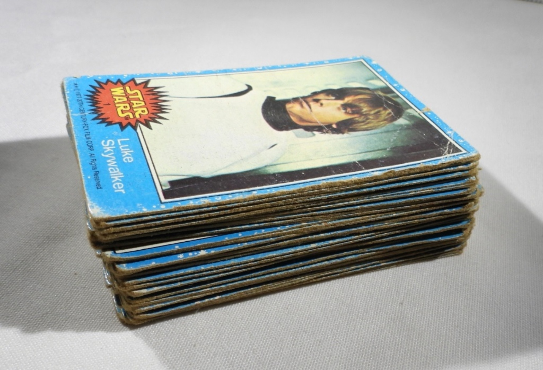 51 STAR WARS TOPPS BLUE DECK TRADING CARDS. MOST HAVE ROUNDED CORNERS AND CREASES.