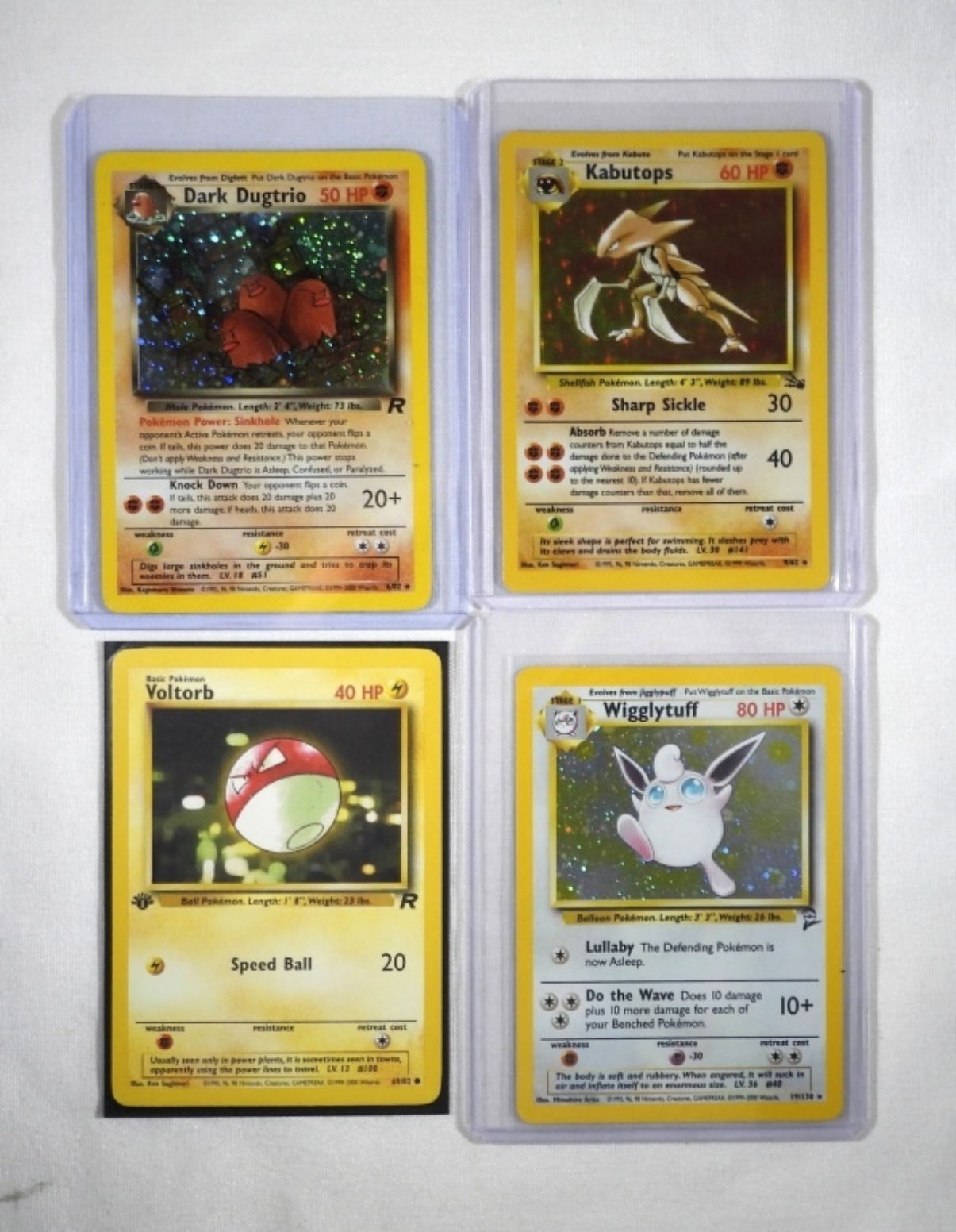 4 POKÉMON CARDS. DARK DUGTRIO REVERSE HOLO 6/82. KABUTOPS FOSSIL REVERSE HOLO 9/62. WIGGLYTUFF REVERSE HOLO 19/130. VOLTORB 1st ED PLAIN CARD 69/82. NM/M