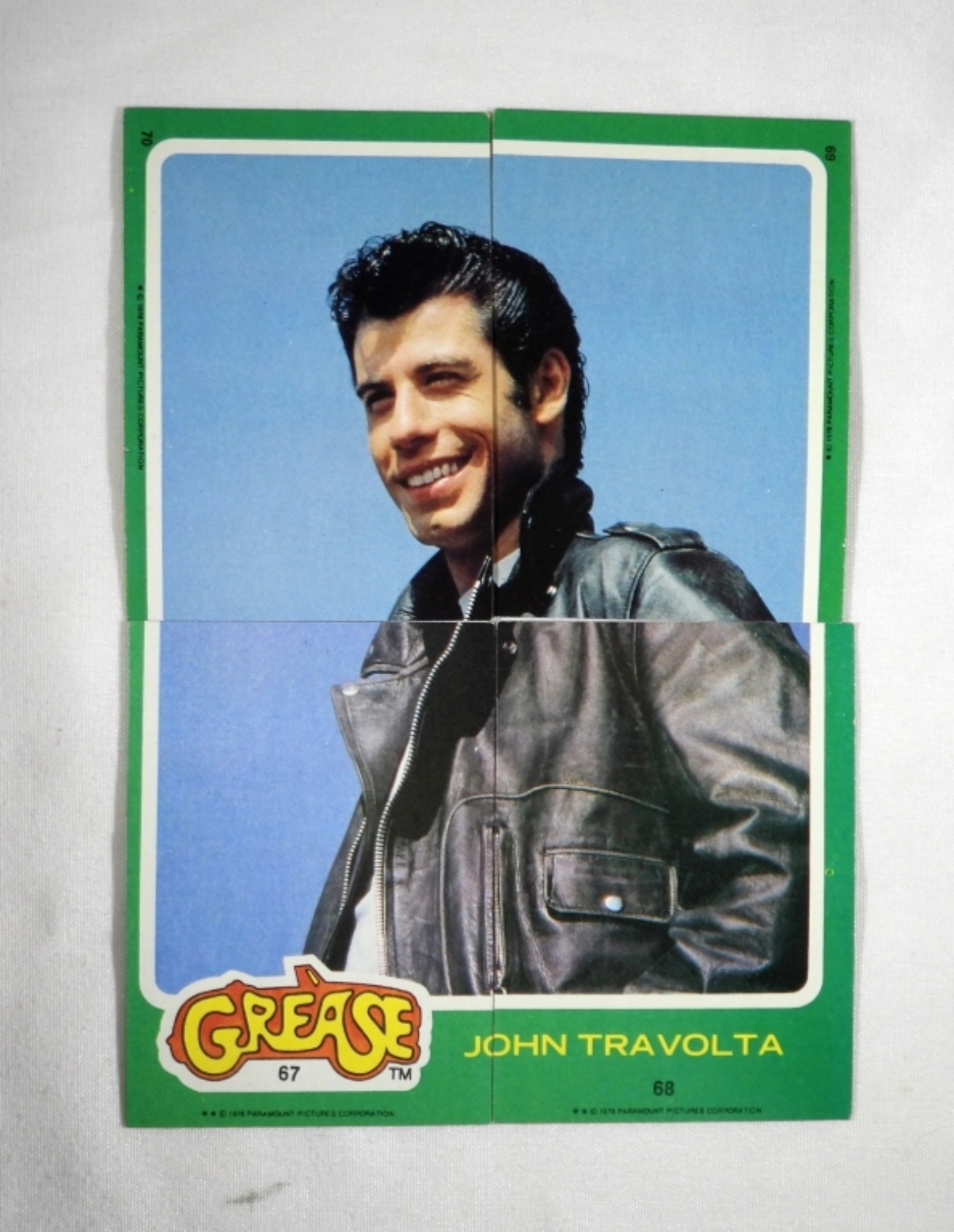 104 GREASE TRADING CARDS, 1978. TRADING CARDS, STICKERS AND 1 FULL (4 PIECE) JOHN TRAVOLTA PUZZLE POSTER. ALL GREEN, THERE ARE SOME DUPLICATES! ALL IN PRETTY GOOD CONDITION. SEE PHOTOS