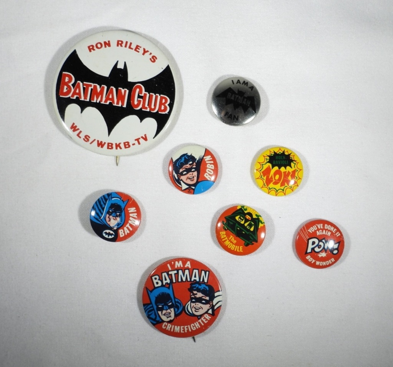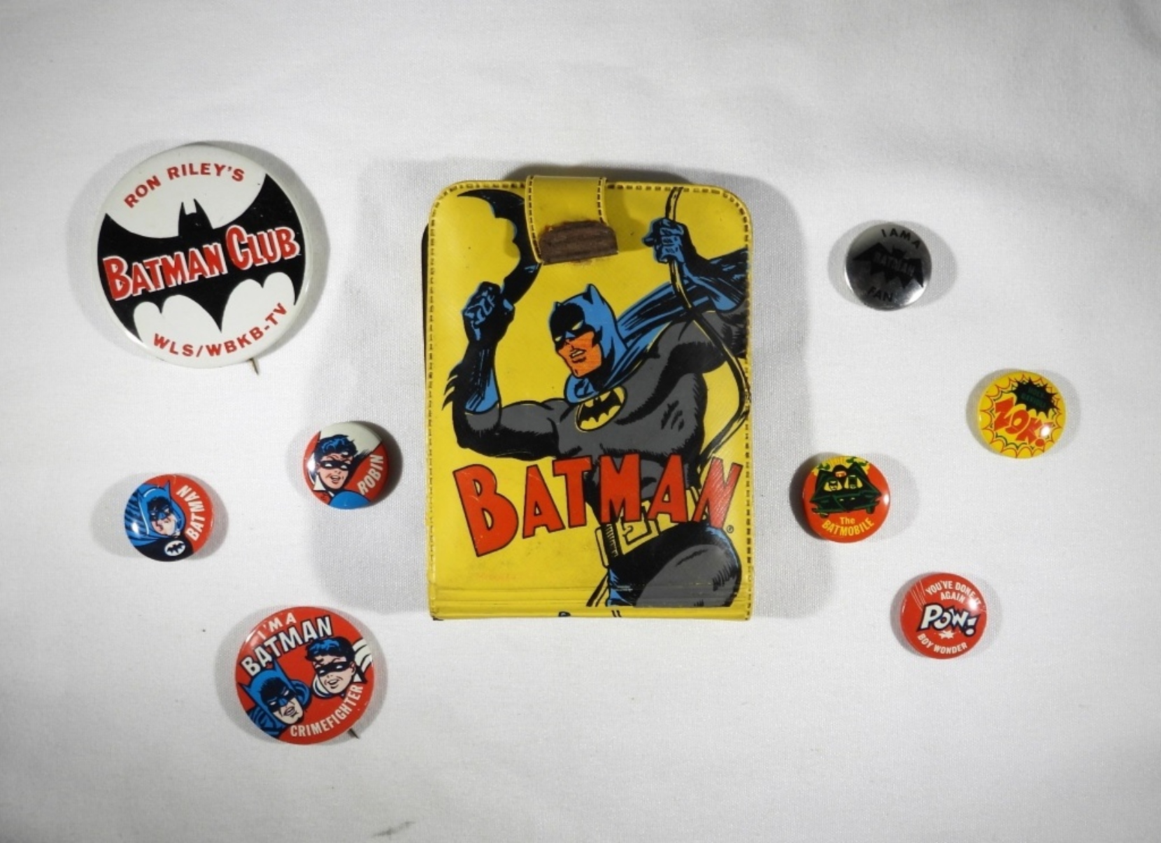 EIGHT VINTAGE 1966 PINBACKS. 1966 BATMAN & ROBIN WALLET BY MATTEL. SEE PHOTOS.