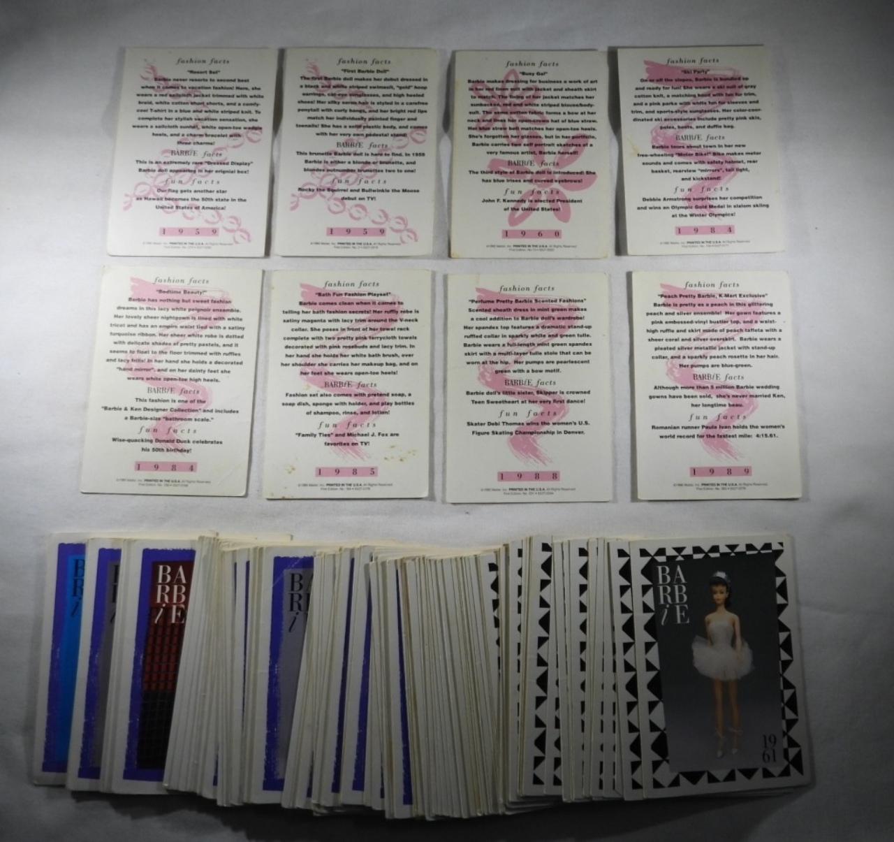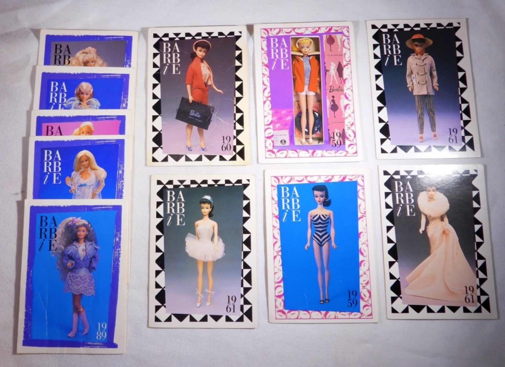 117 BARBIE TRADING CARDS FROM 1990. PORTRAYING BARBIE FROM 1959-1989. USED CONDITION BUT DECENT.