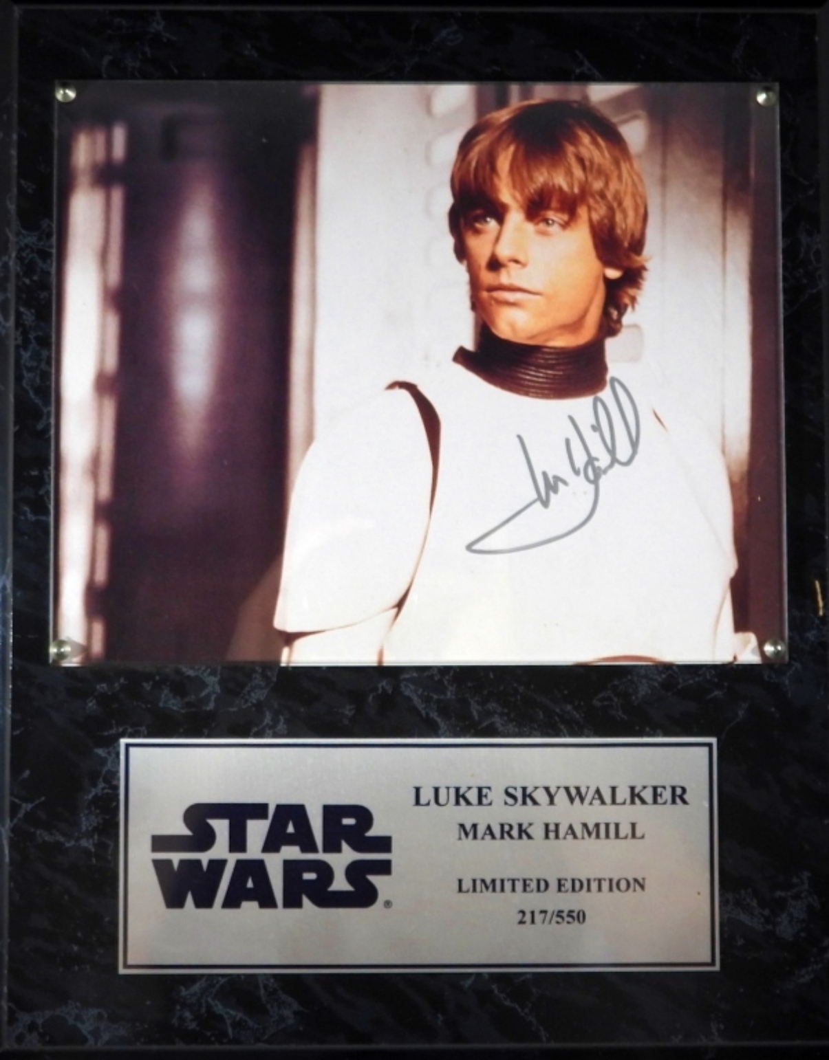 SIGNED PHOTO OF MARK HAMILL “LUKE SKYWALKER” ON PLAQUE – NO COA / UNVERIFIED