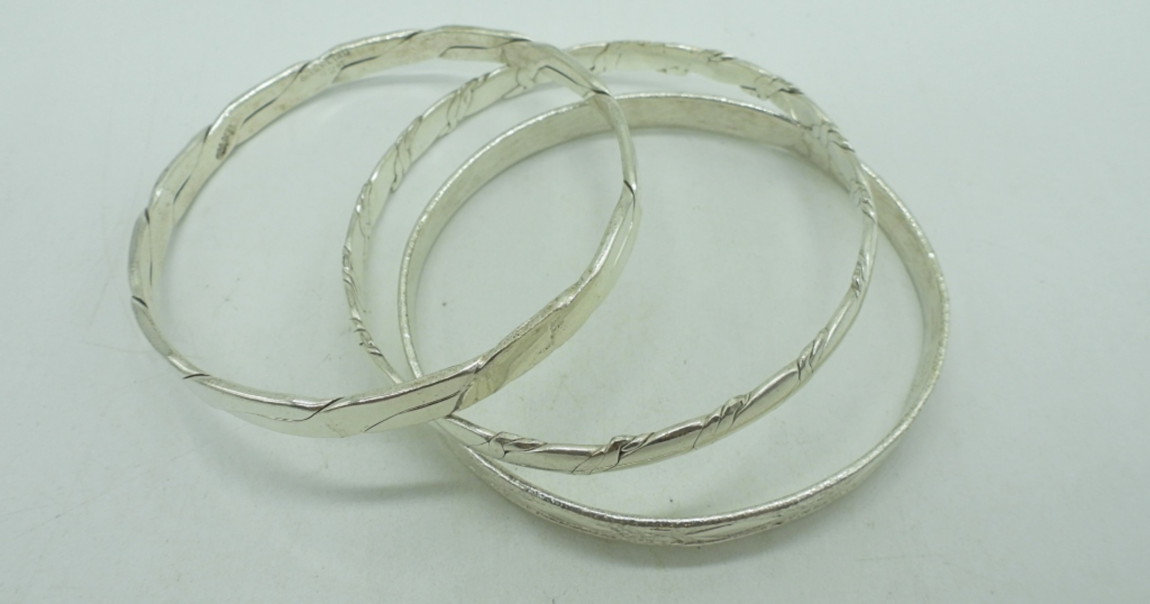 THREE SHINY STERLING BANGLE BRACELETS. 8″. (31.2 DWT)