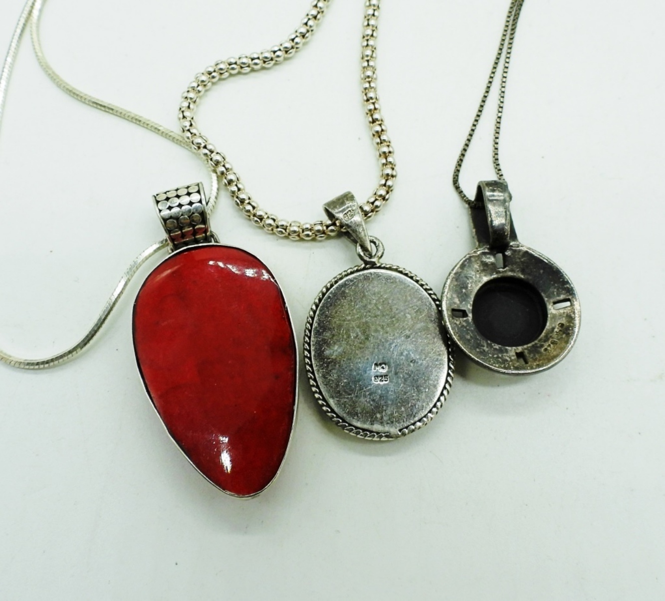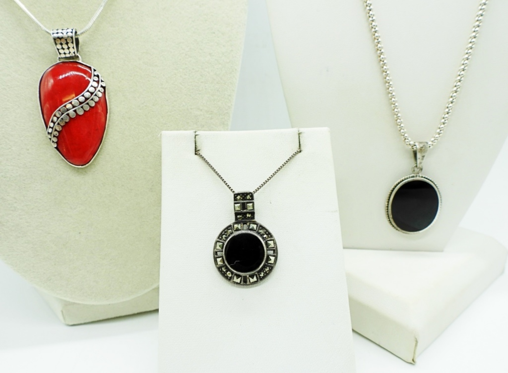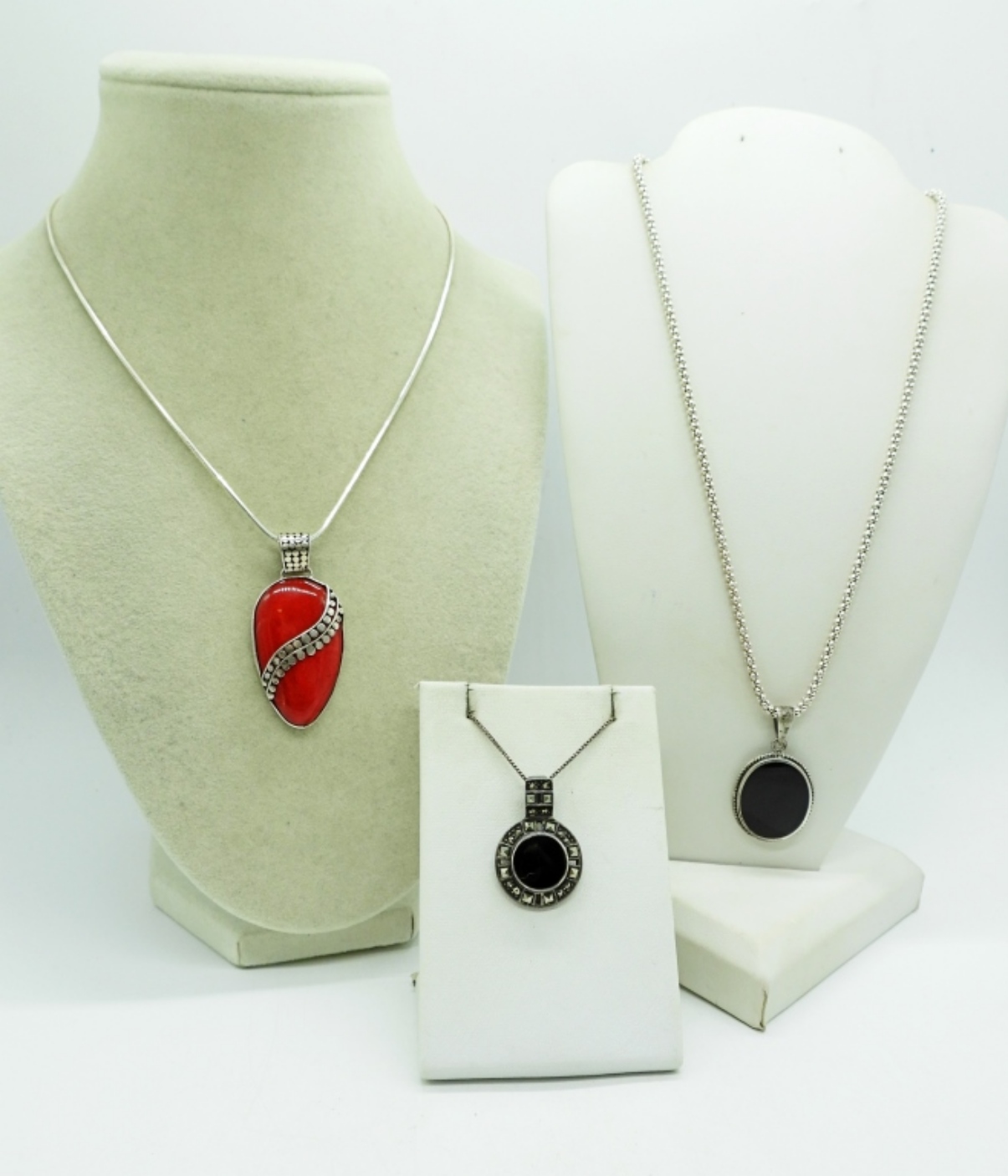 THREE STERLING NECKLACES. RED JASPER AND BLACK ONYX. 16″ & 18″ STERLING CHAINS. (20.2 DWT)
