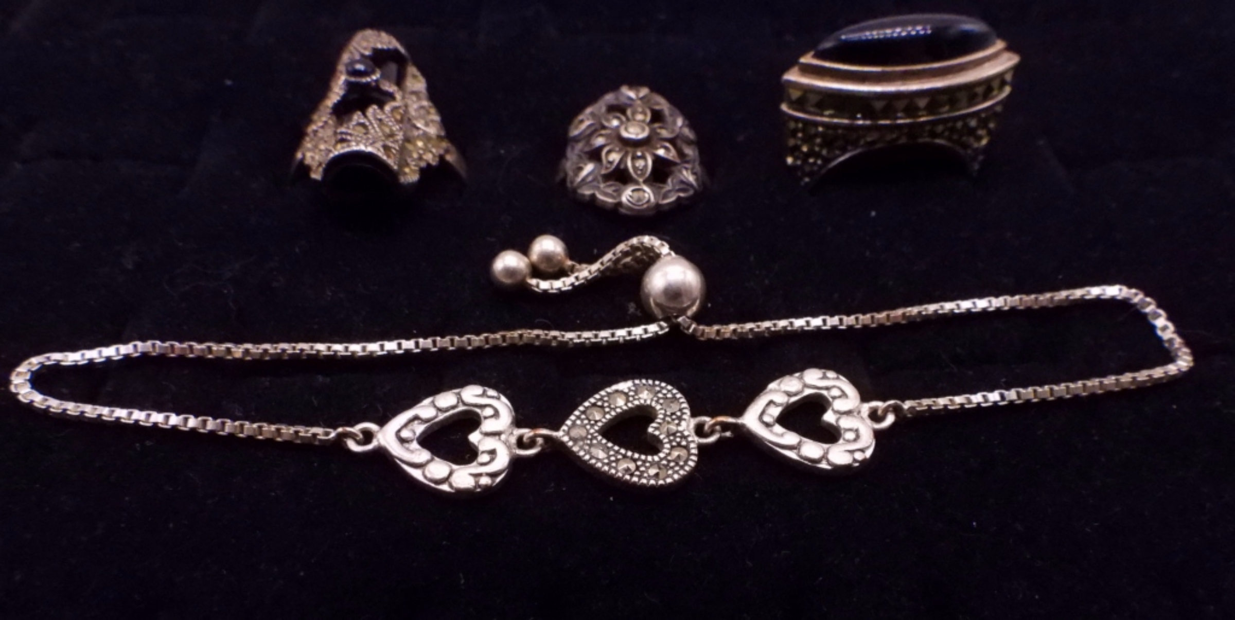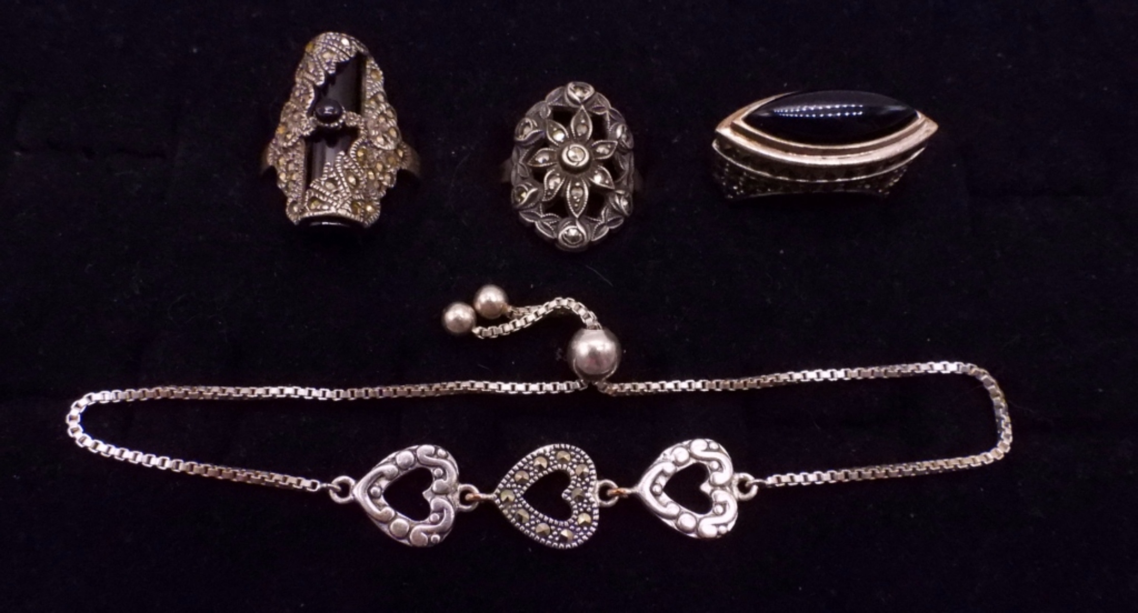 THREE STERLING RINGS WITH BLACK ONYX & MARCASITE GEMSTONES, SIZES 6.5 & 8. STERLING HEART BRACELET WITH MARCASITE, 10″ ADJUSTABLE. (16 DWT)