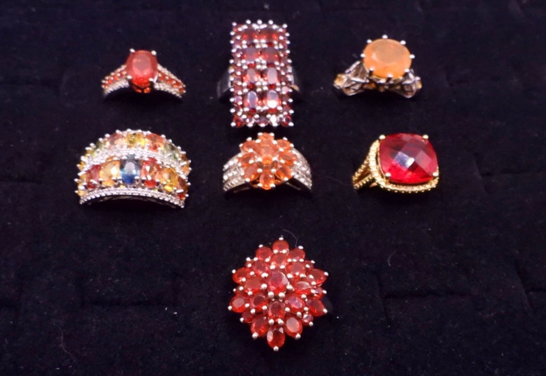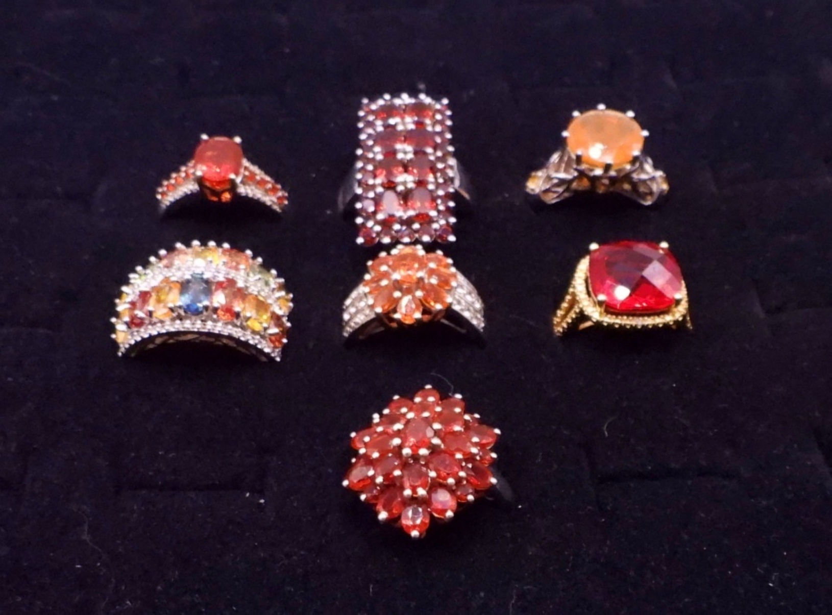 SEVEN STERLING RINGS. RED, ORANGE, YELLOW & MORE SIMULATED GEMSTONES. VERY PRETTY! SIZES 6, 7, 8. (28.3 DWT)