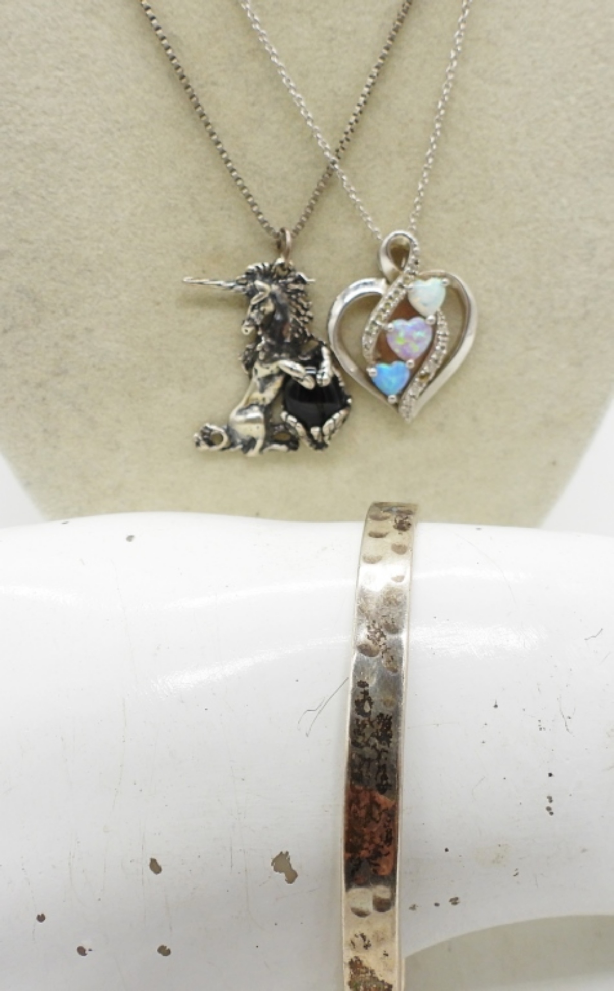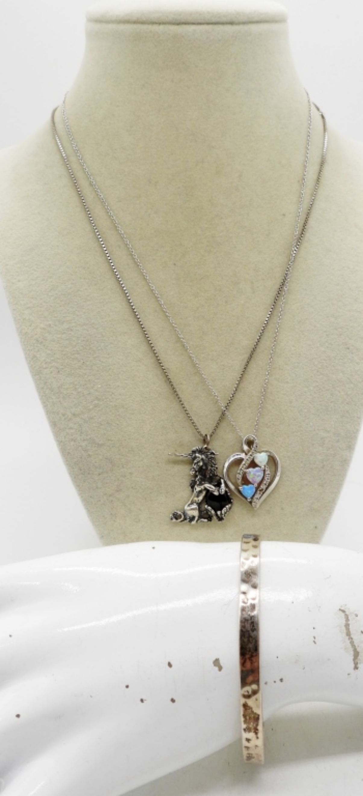 STERLING TAXCO MEXICO CUFF BRACELET “TP-104″. 6”. UNICORN PENDANT & HEART OPAL PENDANT. 18″ CHAINS. (17.2 DWT)